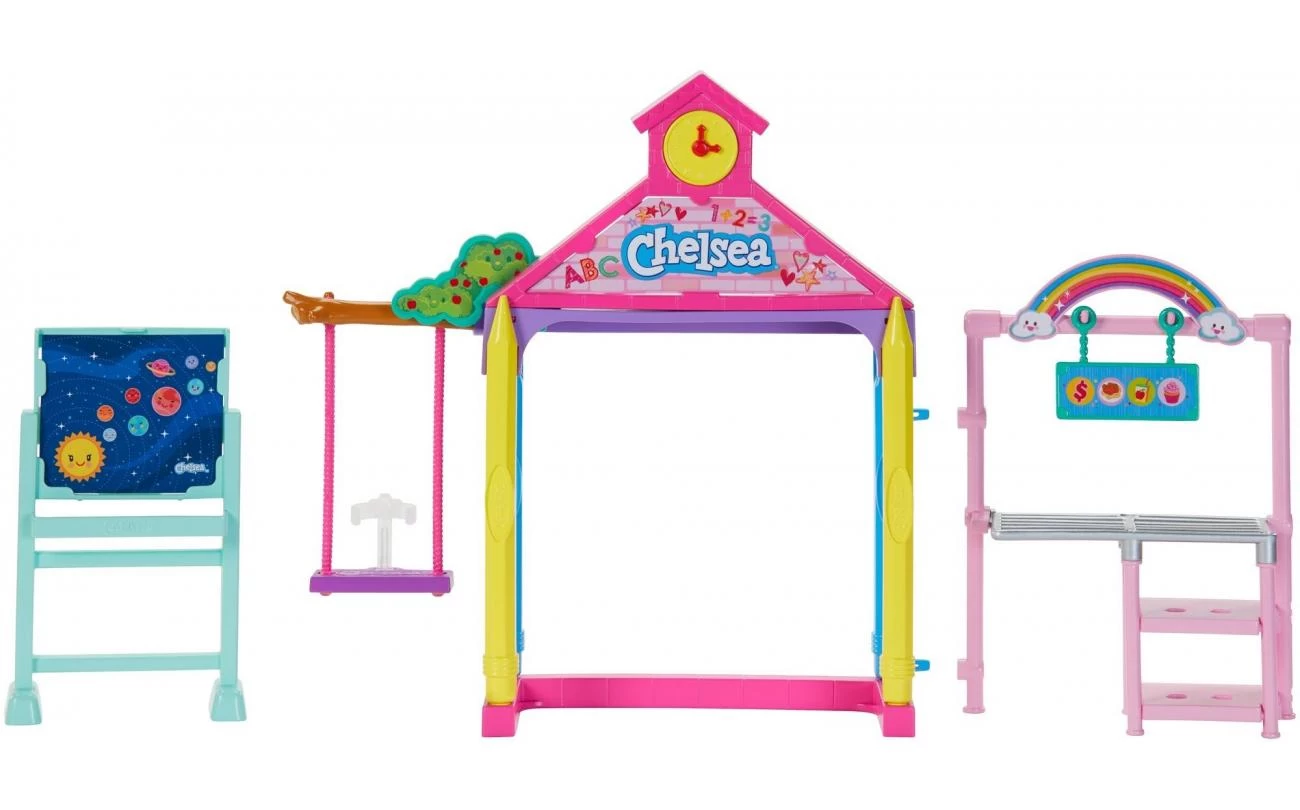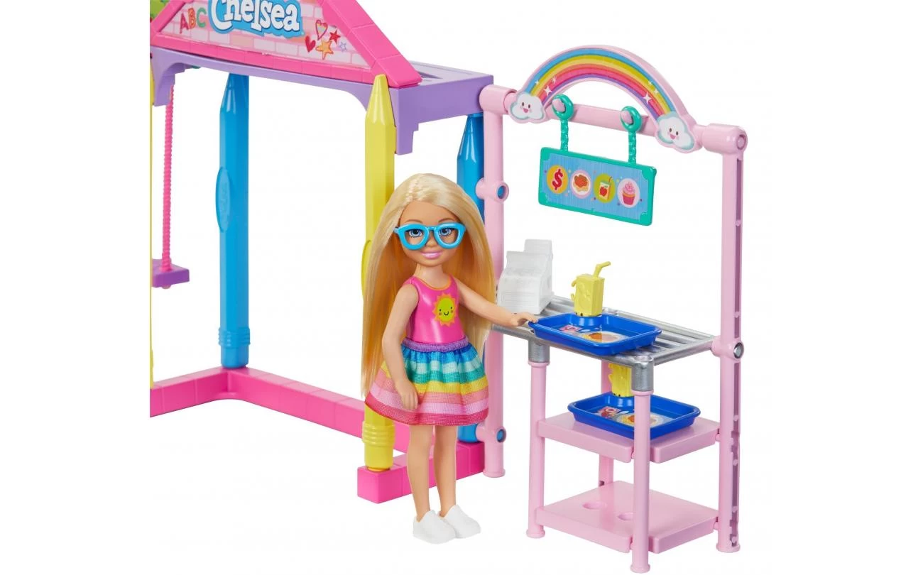 Chelsea en haar vrienden inspireren jonge kinderen om de wereld te ontdekken. Net als haar grote zus Barbie probeert ze graag nieuwe dingen, daagt ze zichzelf uit en maakt ze veel plezier. Deze Barbie Club Chelsea School speelset is de perfecte plaats om te wennen aan het leven in de klas en op het schoolplein! Met de leuk versierde school, de accessoires en de verschillende speelplekken kun je eindeloos verhalen bedenken. Als het tijd is om te leren, zet je Chelsea en haar vriendje (apart verkrijgbaar) op de twee schoolbankjes. Het schoolbord kun je naar voren en naar achteren klappen om zo verschillende onderwerpen te bespreken. Zodra het pauze is, laat je Chelsea van de glijbaan afglijden of zet je haar op de schommel en geeft haar een duwtje! Vergeet niet om iets lekkers te kopen in de cafetaria; er is een toonbank, er zijn dienbladen en er is een kassa – zo kun je weer nieuwe verhalen bedenken.