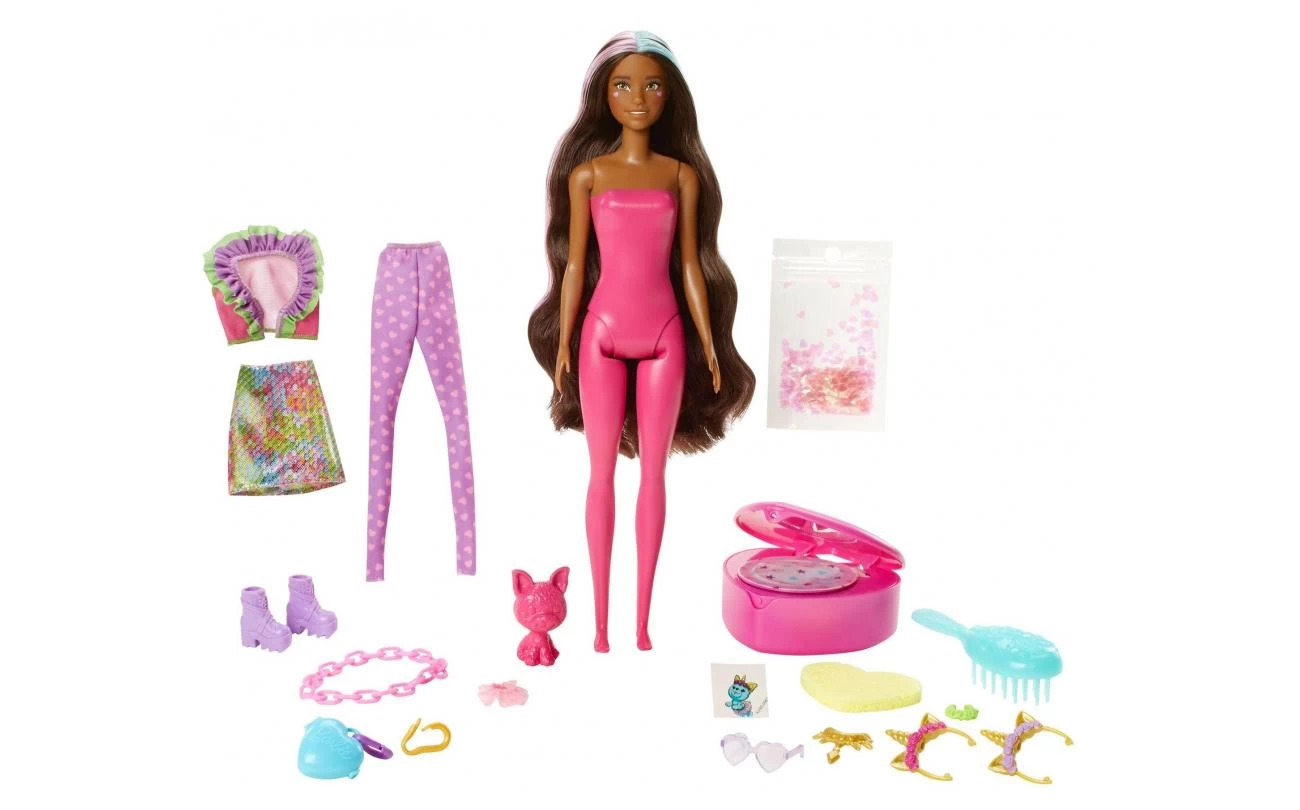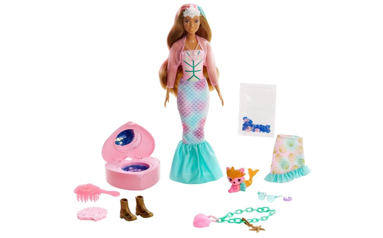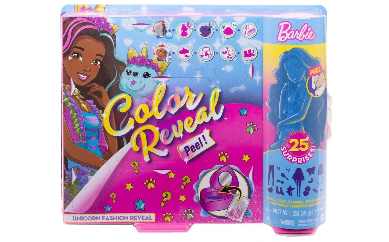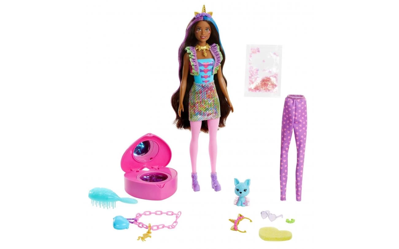 Deze Barbie Kleurverrassing poppen zorgen voor de ultieme uitpakervaring. Er zijn 25 verrassingen, waaronder 4 herhaalbare kleurveranderingen, een huisdier, twee fantastische outfits, glitter en slijm in een hartvormig zakspiegeltje, een Barbie pop, een armbandje met bedeltjes in kindermaat en een sticker! Speel steeds opnieuw met je favoriete fantasietransformaties. De fantasielooks zijn geïnspireerd op een zeemeermin, fee of eenhoorn.