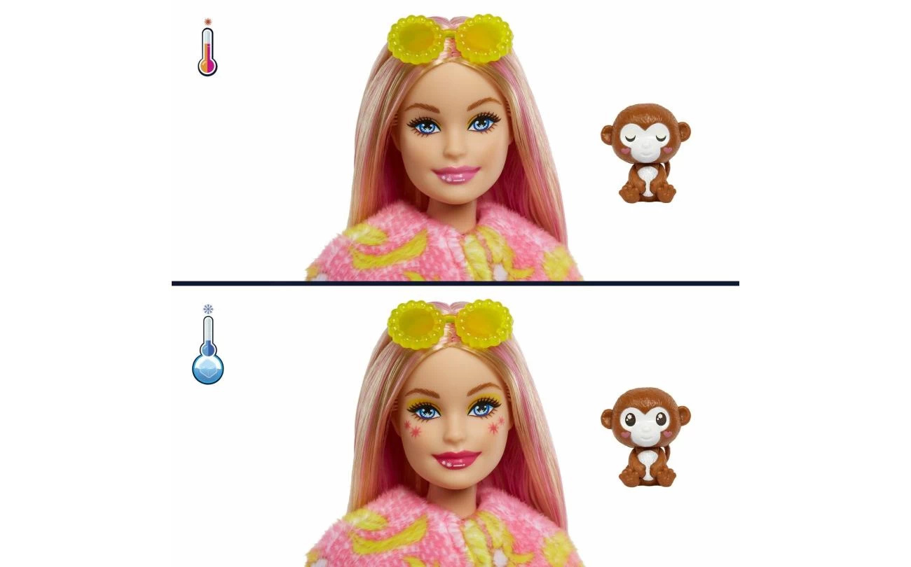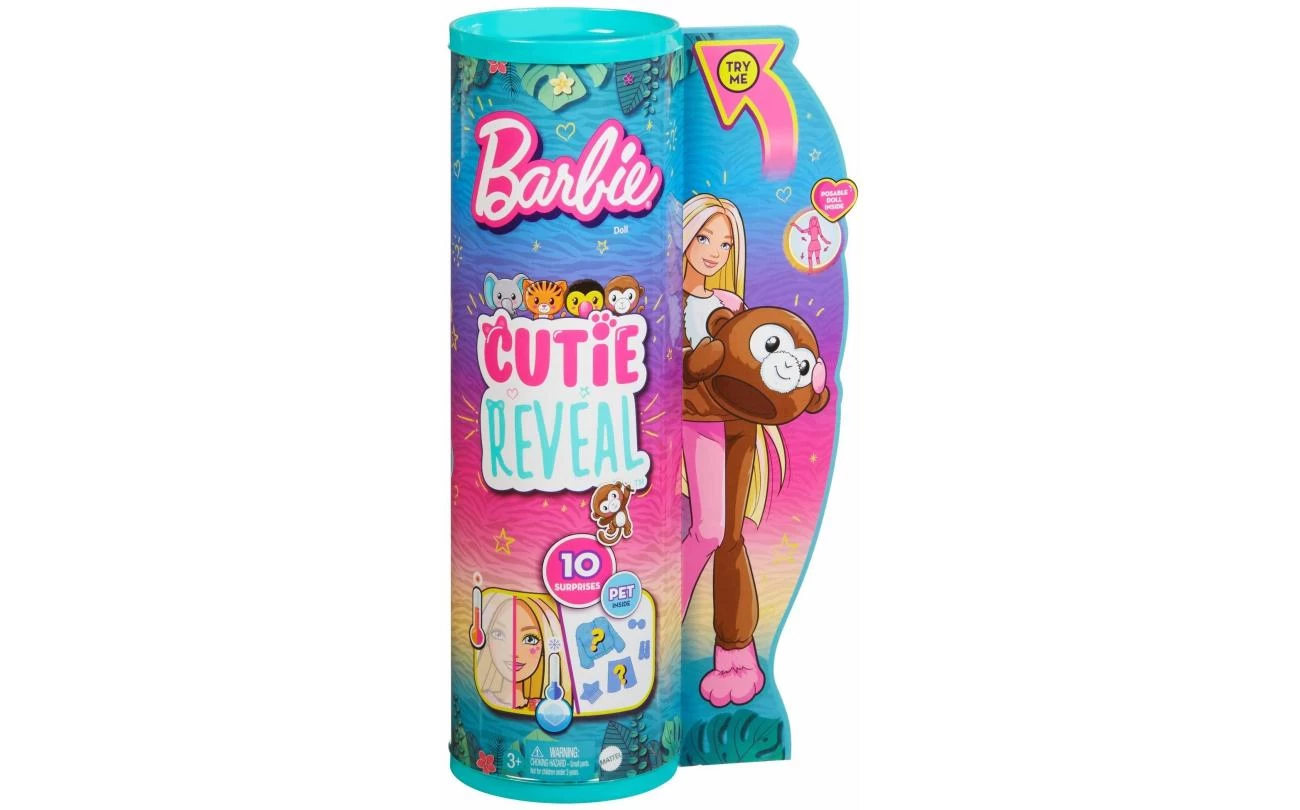 Met de Barbie Cutie Reveal poppen wordt uitpakken een belevenis met maar liefst 10 verrassingen! Maak kennis met een charmante olifant, een lieve tijger, een vrolijke toekan of een brutale aap – trek het dierenpak uit en er komt een beweegbare Barbie pop tevoorschijn met lang, kleurrijk haar. Welke pop heb jij? Elke Barbie pop heeft glanzende glitters op haar gezicht die haar een nog leukere ‘cutie’ maken. Maak er een dolle boel van en maak ook de andere verrassingen open! Wat dacht je van een zonnebril, een rokje of shorts en een minidiertje dat past bij het dierenpak van de pop? Keer de pluchen top binnenstebuiten en je hebt een fleecejack; keer de kop om en er komt een dierenbedje tevoorschijn. Met ijskoud en warm water kun je de kleuren van de pop en het minidiertje veranderen voor nog meer speelplezier! Kinderen vinden het geweldig om alle schattige verrassingen te ontdekken in deze Barbie Cutie Reveal serie met de jungle als thema. Inhoud: pop in dierenpak en 10 verrassingen. De poppen zijn per stuk verkrijgbaar en niet overal leverbaar. Poppen kunnen niet los staan. Kleuren en versieringen kunnen variëren.