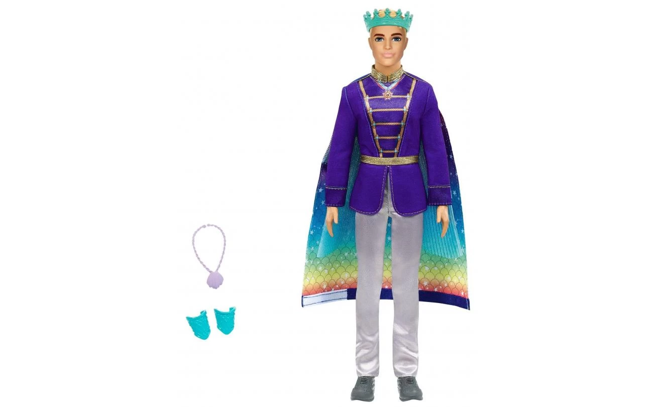 Ken draagt een kroon, twee polsbanden en een op het zeeleven geïnspireerde ketting om de ommezwaai van prins-tot-zeemeerman helemaal af te maken.