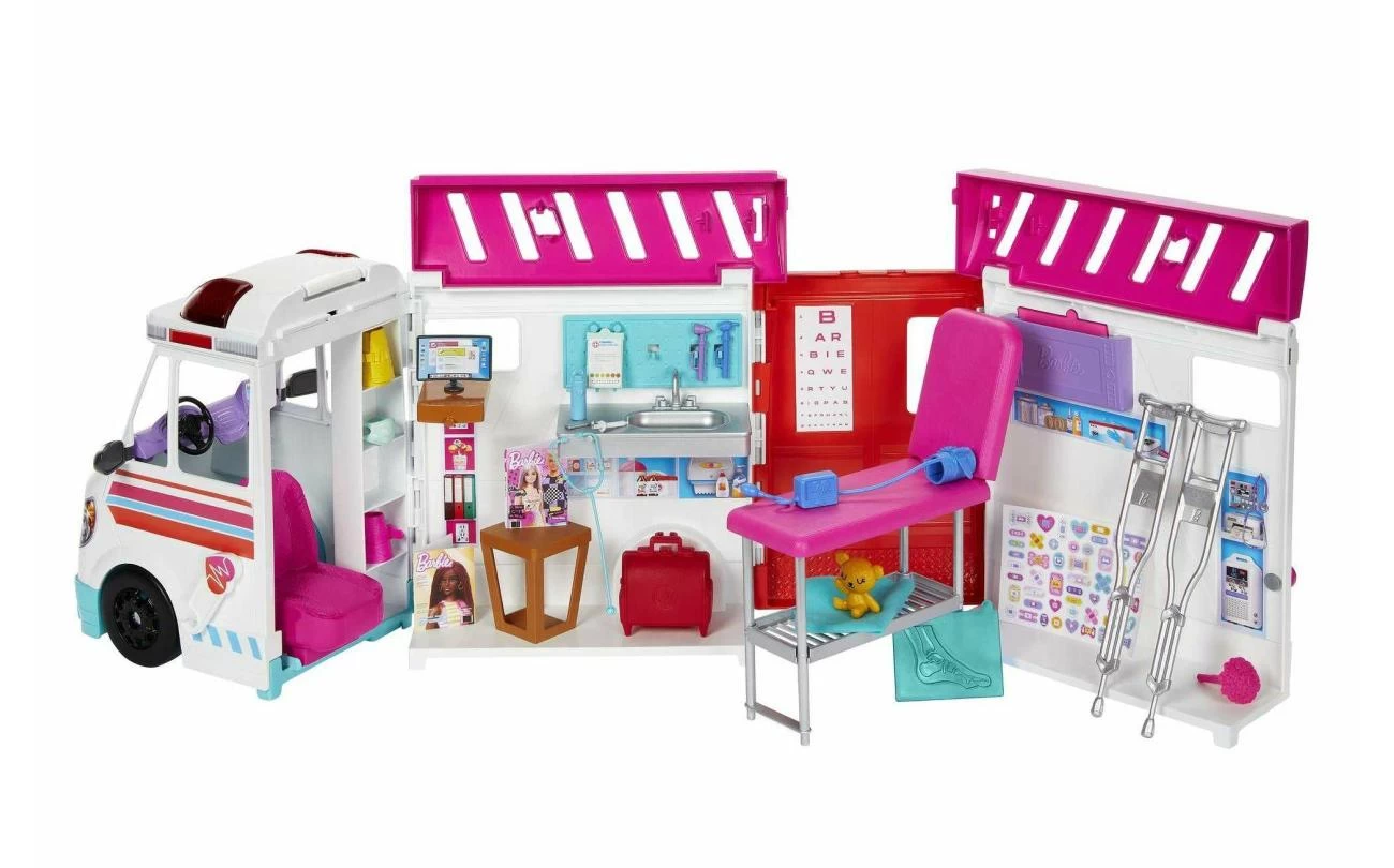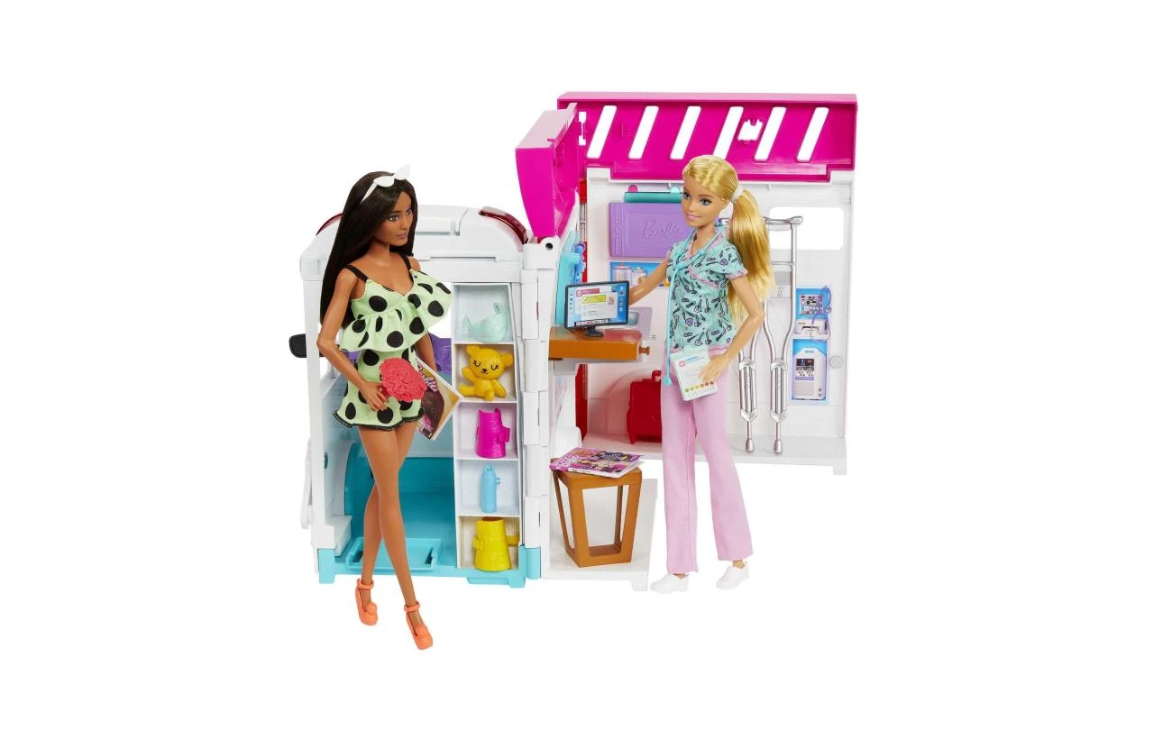 De Barbie Kliniek speelset laat kids hun eigen verzorgende kant als medische professional verkennen. Het kliniekvoertuig kan van een ambulance, compleet met licht en geluid, worden omgetoverd tot een kantoor van een arts, met een onderzoekskamer en -tafel, een receptie en een wachtruimte. Meer dan 20 accessoires inspireren kinderen om na te denken over de zorg voor patinten en om zelf verhalen rondom dit thema te bedenken. Pop niet inbegrepen. Kleuren en versieringen kunnen variren.