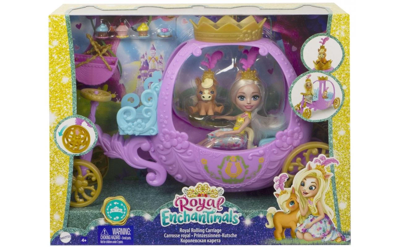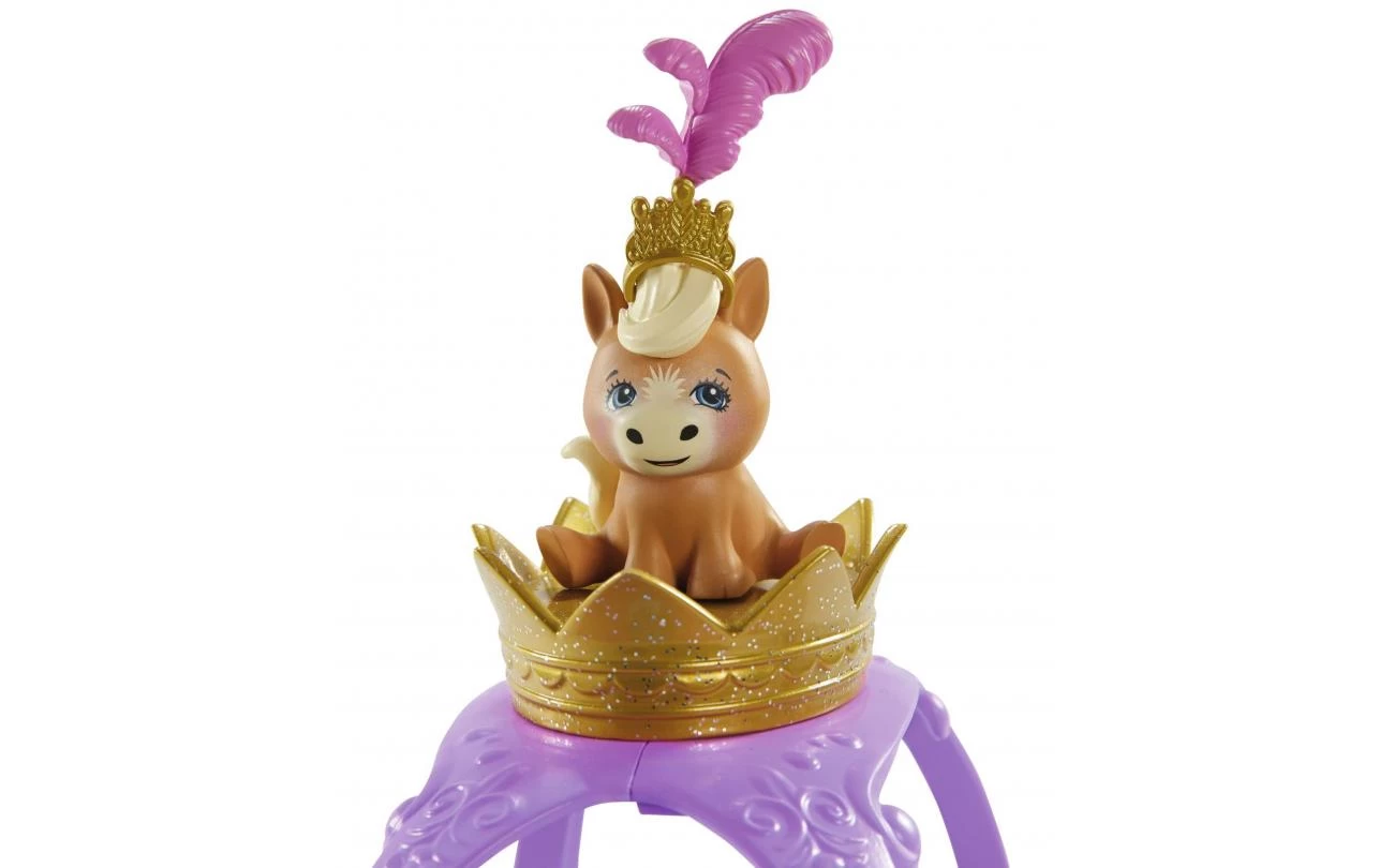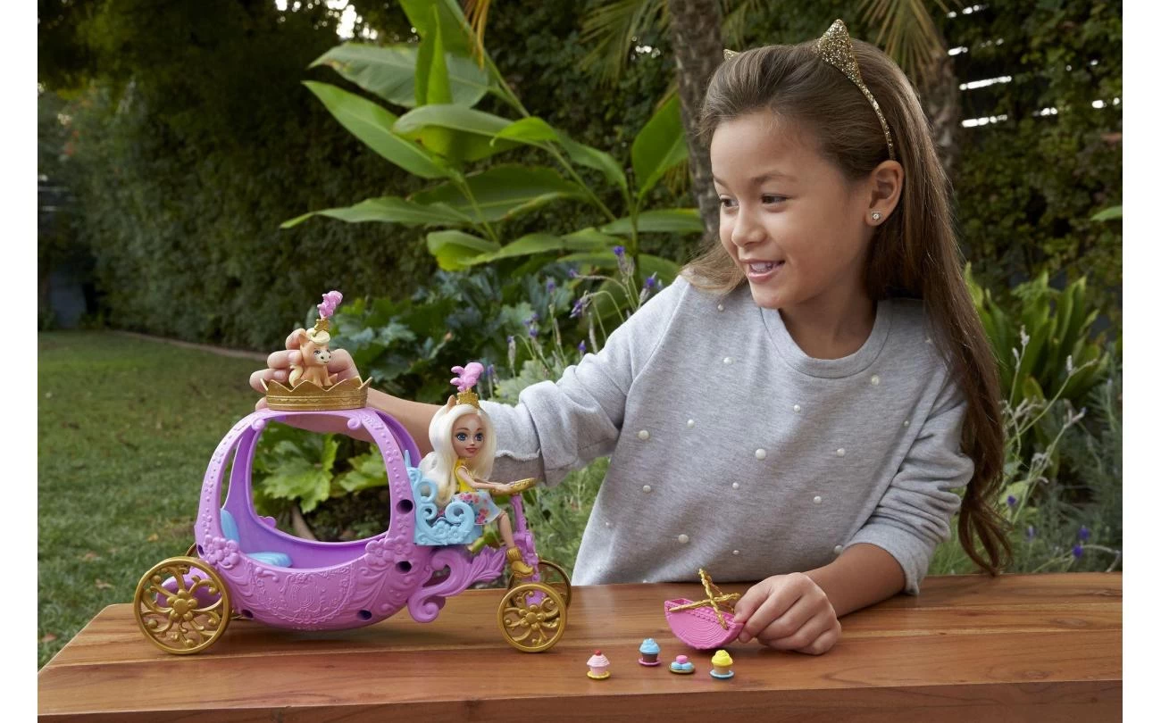 Maak een ritje door de wereld van Enchantimals met Peola Pony en haar koninklijke prinsessenkoets! De koets staat klaar voor koninklijke avonturen. Met meer dan genoeg zitruimte op de bok, in de koets en zelfs boven op de koets kun je een ritje maken door de stad om andere Enchantimals vriendjes op te halen. Geef ‘m een zetje en de pret kan beginnen!