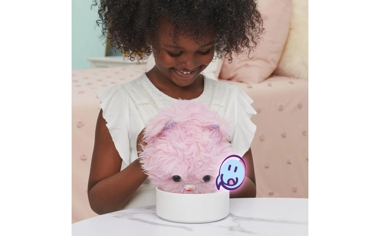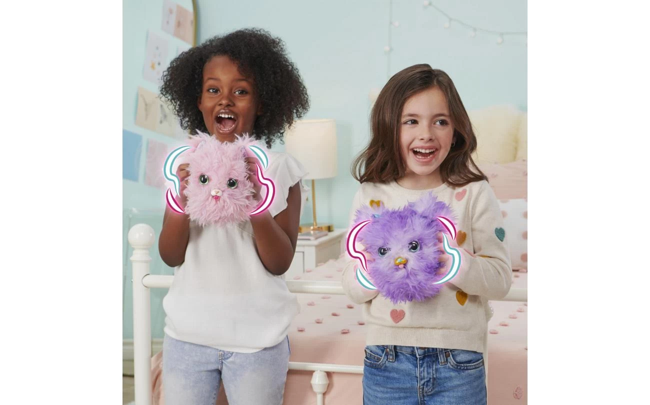 Introductie van Fur Fluffs: pluizige interactieve huisdieren op zoek naar hun pluizige thuis! Dit superleuke speelgoed voor kinderen heeft meer dan 100 opwindende geluiden en reacties en een verrassing voor het onthullen van een huisdier! Verborgen in een zachtroze pluisje zit Purr ’n Fluff. Speel met je verlegen Fur Fluffs-speeltje om haar aan te moedigen uit haar schuilplaats te komen en haar vertrouwen te winnen. Je kunt haar aaien, rollen, schudden, gooien en ondersteboven houden – als je pluisje zich prettiger voelt, onthult ze haar oren! Blijf spelen, en haar ogen zullen ook naar buiten gluren! Zodra Purr ’n Fluff je volledig vertrouwt, hoor je het feestlied en verandert ze van pluis in huisdier! Terwijl je speelt, ontgrendel je de lieve en gekke persoonlijkheid van Purr ’n Fluff. Met zoveel geluidseffecten en reacties weet je nooit wat voor schattige reactie je krijgt! Deze kleine pluis houdt van eten, rollen, knuffelen, dansen, zingen en meer.
