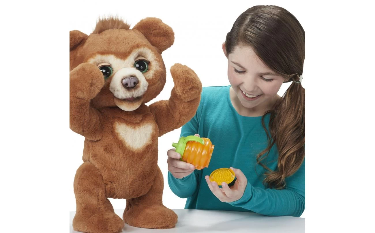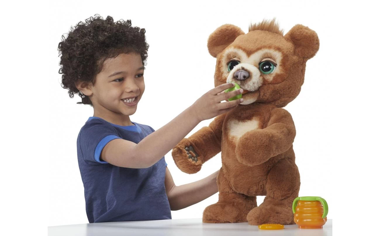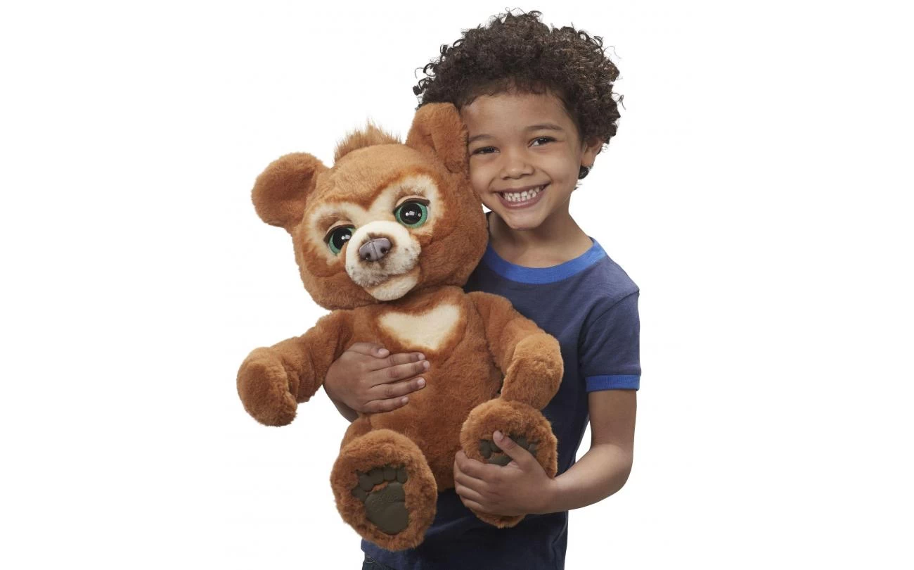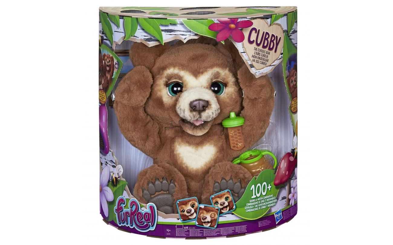 Cubby, het nieuwsgierige berenwelpje van furReal is het interactieve speelgoedvriendje waar kinderen vanaf 4 jaar van dromen – ze kunnen hem meenemen op avontuur en op het einde van de dag heerlijk met hem knuffelen. Het is een nieuwsgierig jong welpje dat graag wordt opgepakt en vastgehouden (hij knuffelt je terug!), hij speelt kiekeboe en danst zelfs af en toe. En laten we het tussendoortje niet vergeten! Als je hem zijn flesje of snack geeft, maakt hij eetgeluidjes. Hij kletst ook graag en babbelt terug als je iets tegen hem zegt. In de nachtmodus sluit het schattige welpje zijn ogen, maakt hij slaperige geluiden en laat hij een van de vier rustgevende melodietjes van 5 minuten horen. Slaap lekker, Cubby! Zijn bewegende ogen, neus en mond maken zijn schattige koppie heel expressief, een onweerstaanbaar welpje!