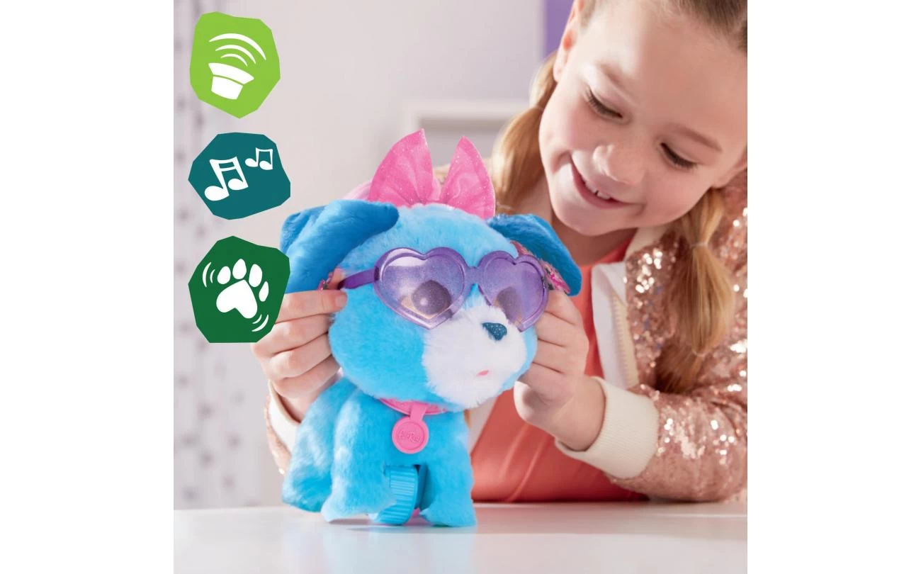 De muzikale furReal Rockalots interactieve lopende puppy is een onweerstaanbare schattige en coole puppy die net zo snel rockt als de kinderen zelf! Als je haar uitlaat, speelt ze 3 leuke liedjes, die sneller gaan als je sneller loopt! Zodra je langzamer loopt, vertraagt ook het ritme van het liedje. Bij deze rockende pup hoort een gitaarvormige borstel waarmee je haar zachte vacht kunt borstelen, een zonnebril met hartvormige glazen en een regenboogrok die ook als haarband kan dienen! Bij dit interactieve diertje hoort een 2-delige riem die los te koppelen is, om met haar te wandelen. Duw haar vooruit met de hondenriem om haar bobblehead te laten bewegen en vrolijke puppygeluiden te horen, evenals rockende melodieën. Maak snel een wandelingetje en waan je op het podium!