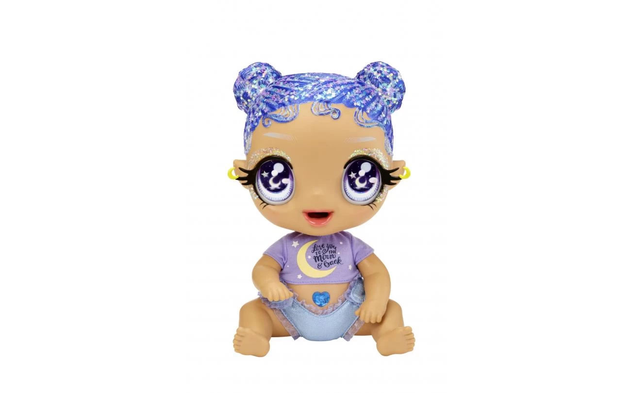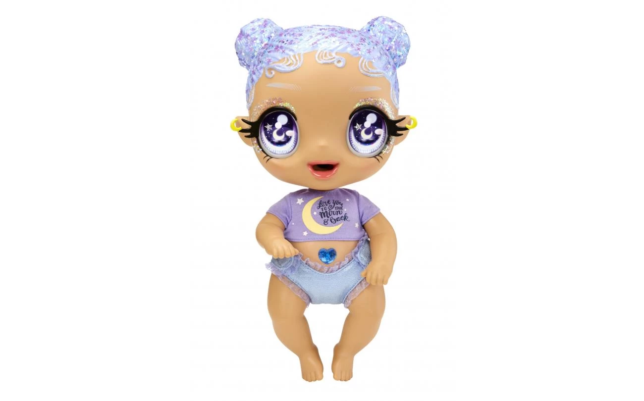 Volg de glinstering tot aan de zonsondergang en sla linksaf bij de maan om de magische wereld van de Glitter Babyz van MGA te ontdekken. Glitter Babyz zijn supermooie, glinsterende en magische baby’s met schattige grote ogen, sprankelende wimpers en glitters in hun haar. elke baby heeft een unieke persoonlijkheid die je terugziet in haar stijl. Ze hebben 3 magische kleurveranderingseffecten: (1) haar haarkleur verandert steeds opnieuw als je haar in bad stopt (badkuip afzonderlijk verkrijgbaar); (2) de magische shampoofles verandert telkens van kleur als je er ijskoud water aan toevoegt; (3) en voeg ijskoud water toe aan het sapflesje om het steeds weer magisch van kleur te laten veranderen. Hou van je pop en zorg voor haar om haar magie in leven en glinsterend te houden. Geef haar haar flesje, verschoon haar luier, stop haar in bad (badkuip afzonderlijk verkrijgbaar) en leg haar daarna neer voor een dutje. Je kunt steeds weer opnieuw voor je baby zorgen en haar vertroetelen. Alle accessoires van je magische Glitter Babyz kunnen opnieuw gebruikt worden, van haar flesjes tot de luiers. Inclusief verwijderbaar T-shirt, herbruikbare glitterluier, speen, sapfles met magisch kleurveranderingseffect, shampoofles met magisch kleurveranderingseffect, glinsterende baby met haar dat van kleur verandert. Adopteer vandaag nog alle vier de baby’s: Dreamia Stardust, Melody Highnote, Marina Finley en Selena Stargazer zijn klaar om met je mee naar huis te gaan. Kijk uit naar hun eenhoornvriendjes, die komen er binnenkort aan!