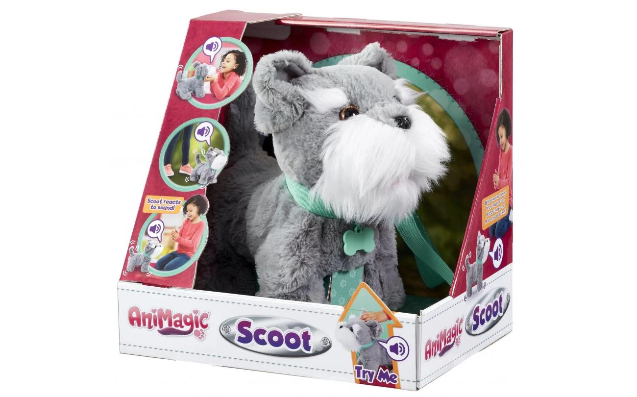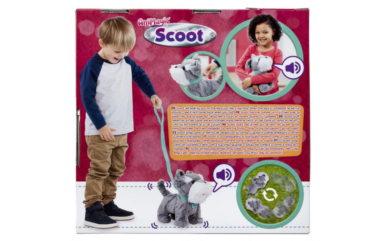 Neem Scoot mee uit wandelen! Deze Animagic knuffel loopt zelf, of met je mee. En Scoot komt ook automatisch naar je toe als je hem roept en klapt! Ongeveer 23cm groot en gemaakt van zachte pluche. De achterkant van dit schattige beestje beweegt tijdens het lopen mee!