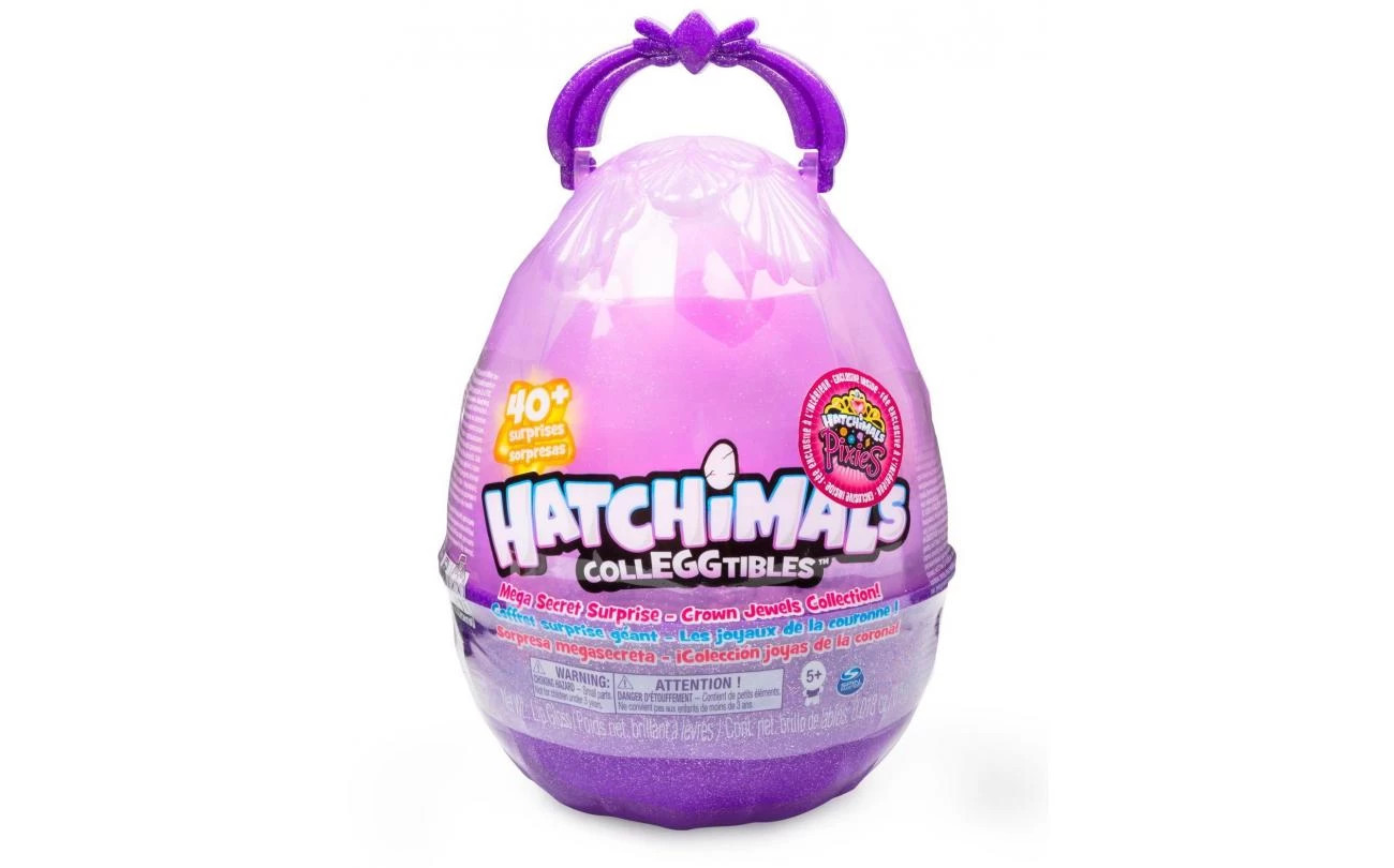 Dit is de ultieme Hatchimals CollEGGtibles-verrassing! Dit mega-ei van 23 cm bevat meer dan 40 koninklijke verrassingen. Het paarse ei is versierd in het kroonjuwelenthema en bevat een exclusieve Pixies Royal en 10 exclusieve Hatchimals CollEGGtibles-figuren! Het ei kan op meerdere plekken worden gebroken en er zijn meerdere compartimenten die kunnen worden geopend. Het ei bevat 10 speciale kronen die je CollEGGtibles kunnen dragen, zes koninklijke accessoires voor je Pixie, Hatchtopia Life-fiches waarmee je toegang krijgt tot exclusief materiaal in de gratis app, een lipgloss in de vorm van een juweel en Royal Hatchimals-stickers. Je kunt al je nieuwe verrassingen in het ei opbergen en je kunt het ei eenvoudig dragen aan het handvat. Meer dan 40 spannende verrassingen: zo’n verrassingsei heb je nog nooit gehad!
