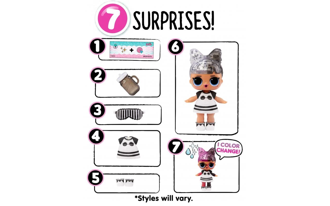 Maak kennis met de LOL Surprise Glitter Color Change™-poppenverzameling! De populaire van kleur veranderende poppen zijn terug met een duizelingwekkende update en een compleet nieuwe verrassende kleurverandering. Elk opnieuw uitgebracht bij fans favoriet personage wordt geleverd met 7 verrassingen om uit te pakken, inclusief een opvallende outfit, meerdere accessoires en haar met glitters voor een glamoureuze nieuwe look. Begin je avontuur met kleurverandering door de pop water uit het flesje te voeren en de luchtbellenstop te plaatsen. Draai en schud de pop om te zien hoe het sprankelende haar zwiert en tot leven komt. Dompel je pop dan in koud of warm water en ontdek de unieke verrassing met kleurverandering van elk personage. Verzamel alle 12 de poppen en hun familie als je de Lil Sis en het diertje vindt van elk van de fantastische B.B.’s in de LOL Surprise Glitter Color Change™ Lil Sis- en in de LOL Surprise Glitter Color Change™-dierenverzamelingen.