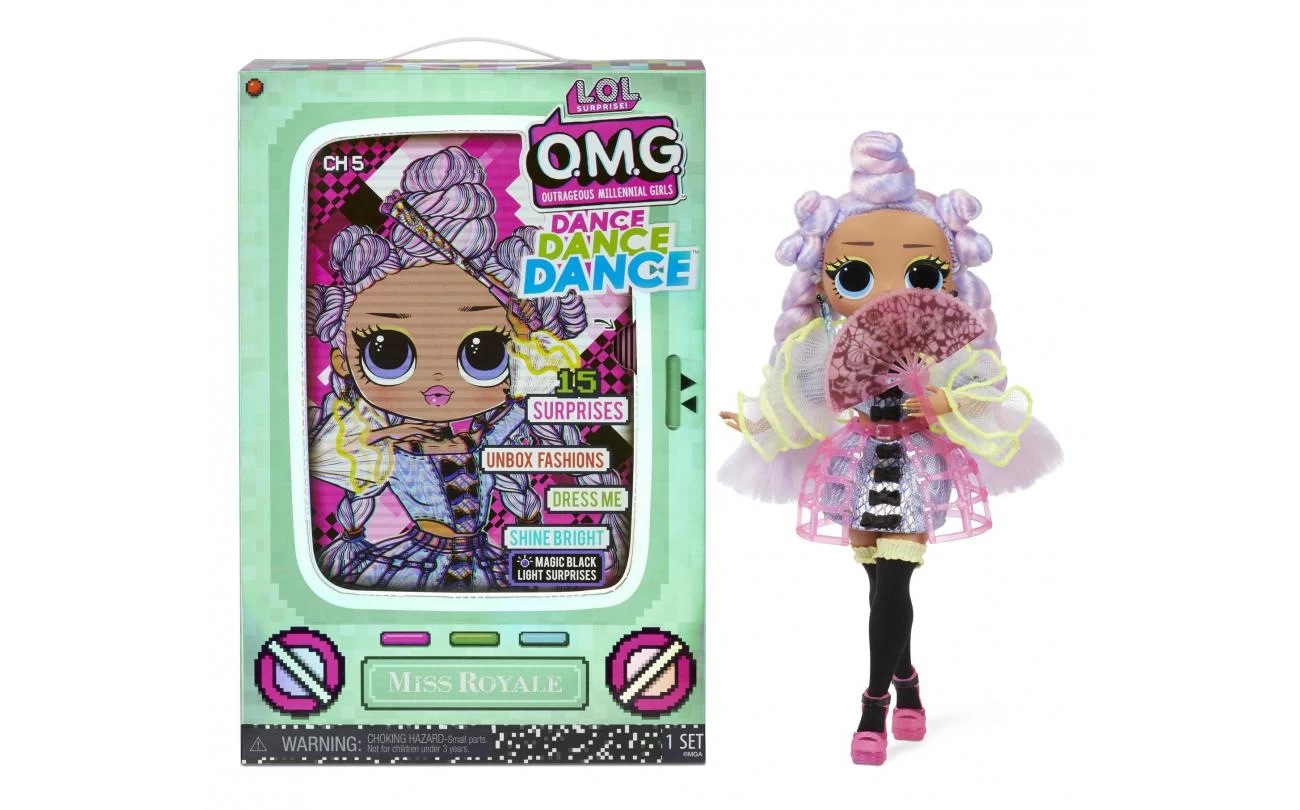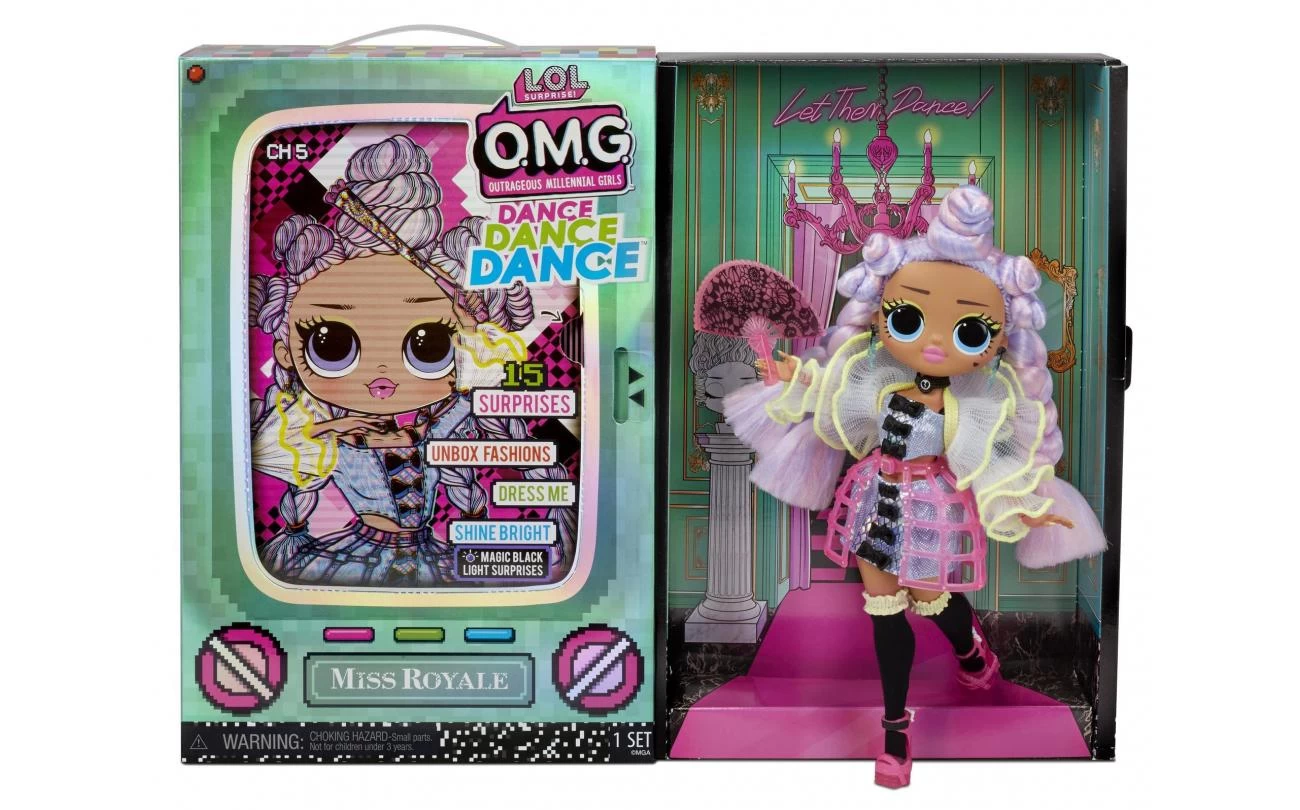 Pak de LOL Surprise Dance Dance Dance OMG-modepop Miss Royale uit met 15 verrassingen. Miss Royale steelt de show met haar Vogue-dans in haar fantastische mode. Ze heeft een verbluffend mooi gezichtje, prachtig haar en haar eigen fenomenale stijl. Bovendien is ze de grote zus van het favoriete LOL Surprise-personage Royal High-ney! Pak de tv-verpakking uit, waarin elk personage echt beweegt op het geperforeerde ‘dansscherm’ als je de bovenkant verwijdert en aan het lipje trekt. Pak de unieke dansmove van Miss Royale uit en schitter op de dansvloer! Check de magische blacklight-verrassingen in de verpakking. Pak haar fantastische kledinghoes uit voor haar mode en open haar hoedendoos om haar accessoires te bekijken. Zet haar in een fotogenieke pose op de inbegrepen poppenstandaard om met haar te pronken. De verpakking wordt een herbruikbare speelset waar Miss Royale haar moves kan laten zien. Inhoud: modepop, mode, schoenen, accessoires, hoedendoos, blacklight, haarborstel, kledingzak, sticker, kleerhanger, poppenstandaard en herbruikbare verpakking als speelset.
