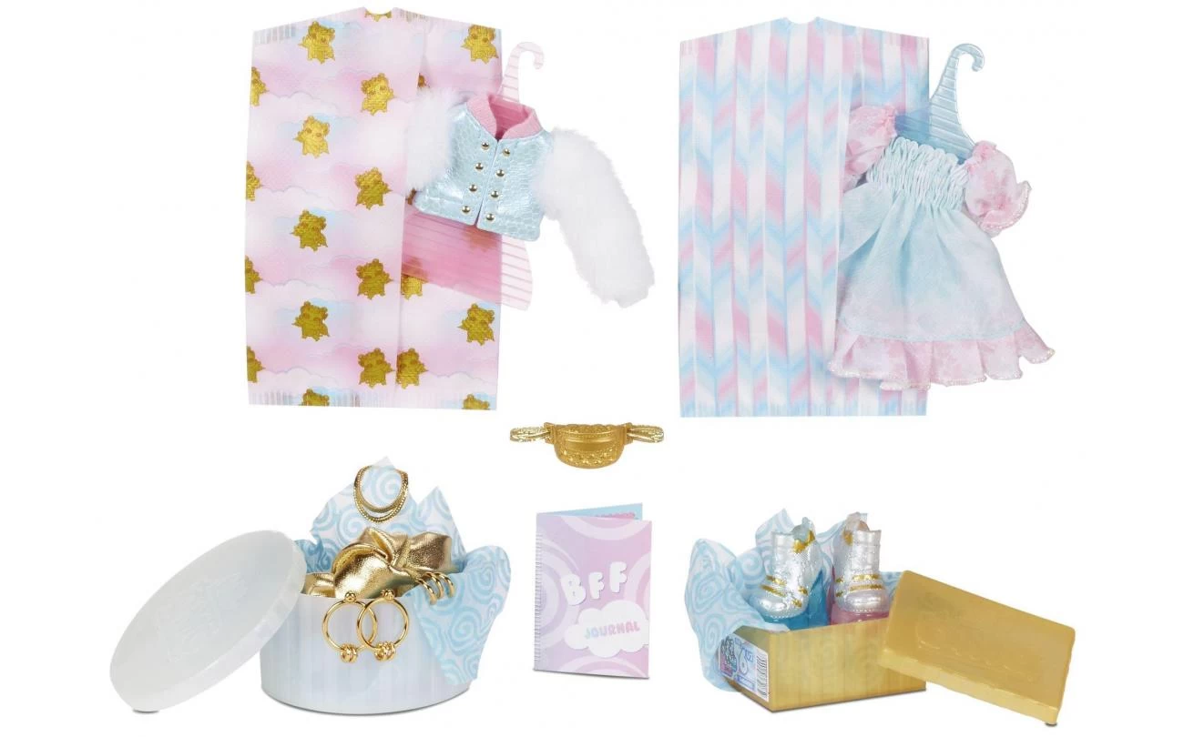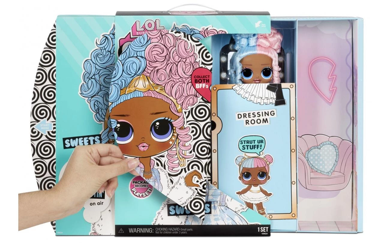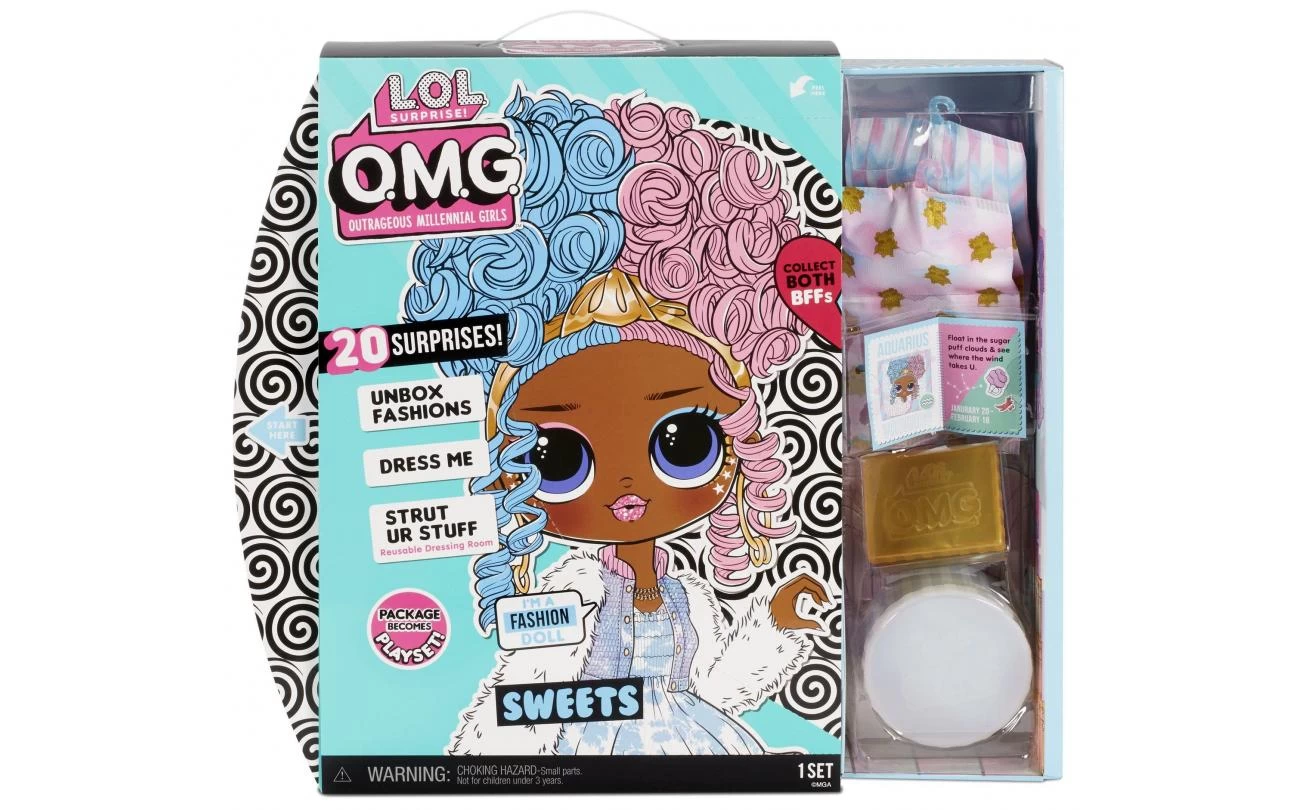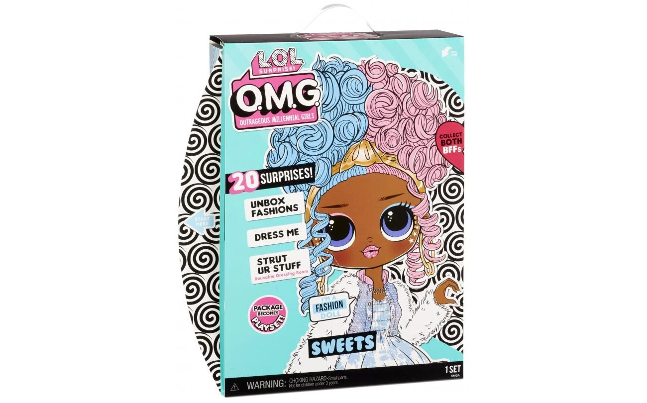 Het leven is het leukst als je kunt laten zien wie je bent! Pak de modepop Sweets van de LOL Surprise OMG-serie 4 uit met 20 verrassingen. Sweets heeft een verbluffend mooi gezichtje, prachtig haar en haar eigen fenomenale stijl. Bovendien is ze de grote zus van het favoriete LOL Surprise-personage Sugar! Tegenpolen zijn bijzonder! De poppen van de LOL Surprise OMG-serie 4 zijn tegenpolen. Elke verpakking is inclusief een verwijderbare helft van een hart. Verzamel zowel Sweets als Spicy Babe om van de twee helften één hart te maken! De verpakking is een herbruikbare speelplek voor Sweets om haar mode te showen en haar persoonlijkheid te laten zien. Pak Sweets fantastische kledinghoes uit voor haar mode en open haar hoedendoos om haar accessoires te bekijken. Zet haar in een fotogenieke pose op de inbegrepen poppenstandaard om met haar te pronken. Inhoud: modepop, outfit, schoenen, accessoires, hoedendoos, haarborstel, kledinghoes, sticker, kledinghanger, poppenstandaard en herbruikbare verpakking als speelset. Zweef met Sweets door de suikerspinwolken en kijk waar de wind je naartoe voert!