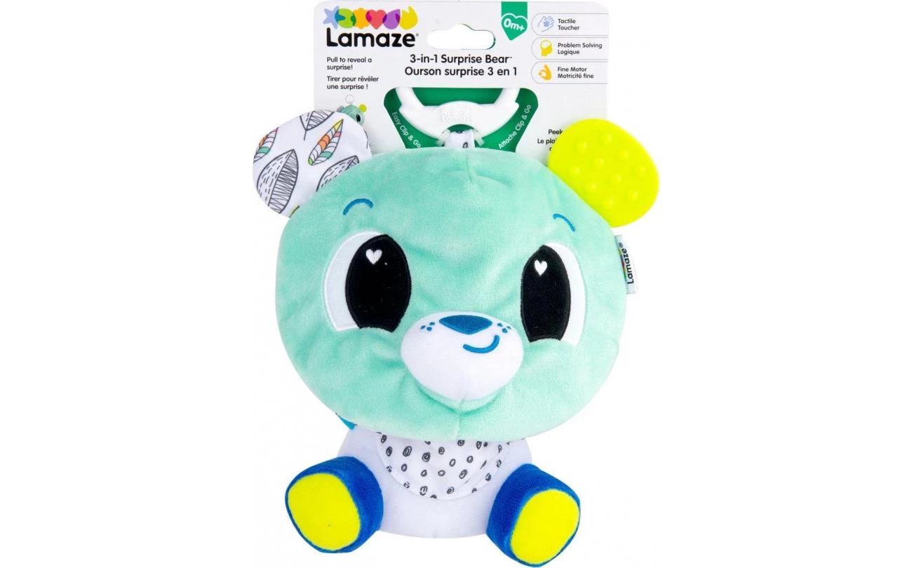 De Lamaze 3-in-1 Verrassingsbeer lijkt op het eerste gezicht een gewone knuffelbeer, maar als je goed zoekt, zul je nog eens twee beertjes vinden! Trek en ze komen allemaal tevoorschijn en is het gezin compleet: papa, mama en baby beer! Baby beer zit lekker in het buikzakje van mama en kan eruit gehaald worden om mee te spelen en te knuffelen. Papa’s rechteroor dient ook als bijtspeeltje. Kleintjes vinden het heerlijk om de zachte stoffen met verschillende texturen aan te raken en naar de vrolijke kleuren te kijken. Met handige ophangclip om aan wandelwagens en luiertassen te hangen. Leeftijdsindicatie: 0 maanden+.