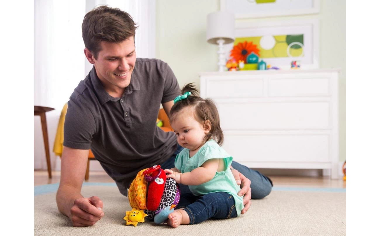De Lamaze Grijp en Verstop Bal™ is een speelbal met verschillende geluidjes, texturen en heldere kleuren. Deze leuke bal stimuleert je baby om te spelen en te ontdekken. Elk gedeelte van deze bal geeft een leuk geluid of krinkelende stof om te ontdekken. De bal is eenvoudig vast te houden, te rollen en te duwen wat bijdraagt aan de ontwikkeling van de motoriek van je baby, Met het olifantje en de leeuw kan je baby verstoppertje spelen. Trek aan de één en de andere zal zich verstoppen in de bal.