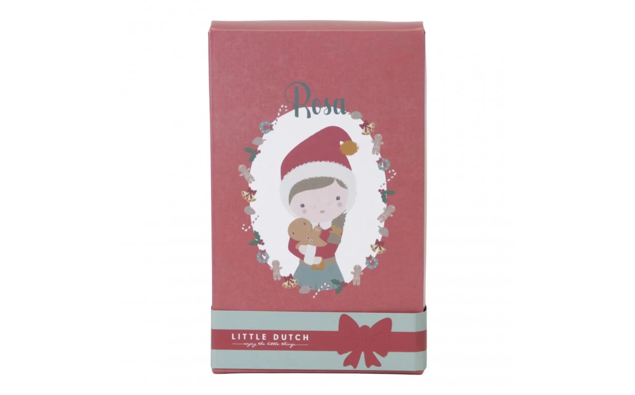 Dit is lieve Rosa. Deze pluche knuffelpop van Little Dutch in een schattig kerstoutfitje wil graag geknuffeld worden. Rosa kan rechtop blijven zitten en rijdt graag met je mee in de houten poppenbuggy van Little Dutch