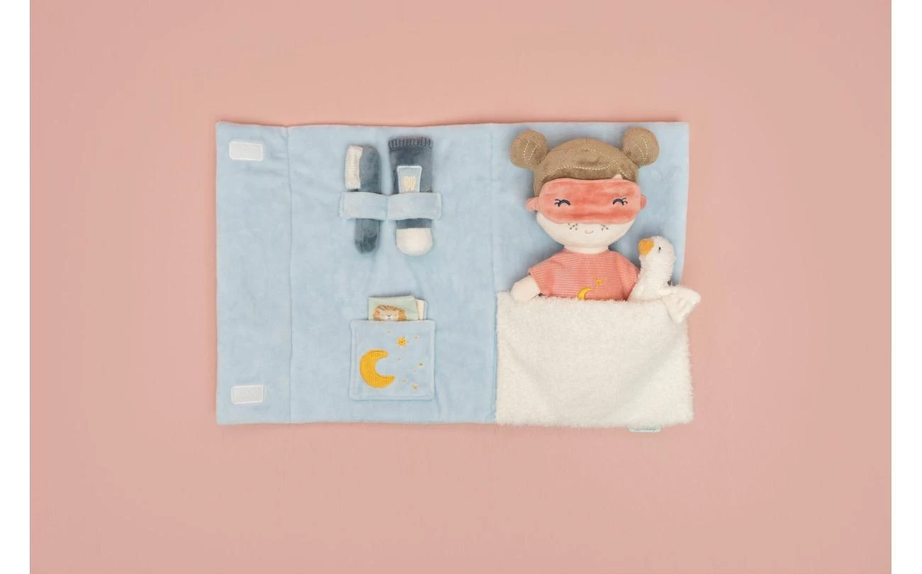 Deze logeer speelset voor pop Rosa zorgt voor vele uren rollenspel. De zachte lichtblauwe koffer kan opengevouwen worden tot een bed en bevat de schattigste slaapaccessoires om het bedtijdritueel na te spelen. Je kleintje kan Rosa’s pyjama aandoen, haar voorbereiden op bedtijd met de tandenborstel en tandpasta, knuffelen met Little Goose en samen een verhaaltje lezen uit het voorleesboekje over dieren. Als het tijd is om te gaan slapen, gaat Rosa’s slaapmasker op en kan ze worden toegedekt met de zachte teddydeken. Welterusten Rosa.