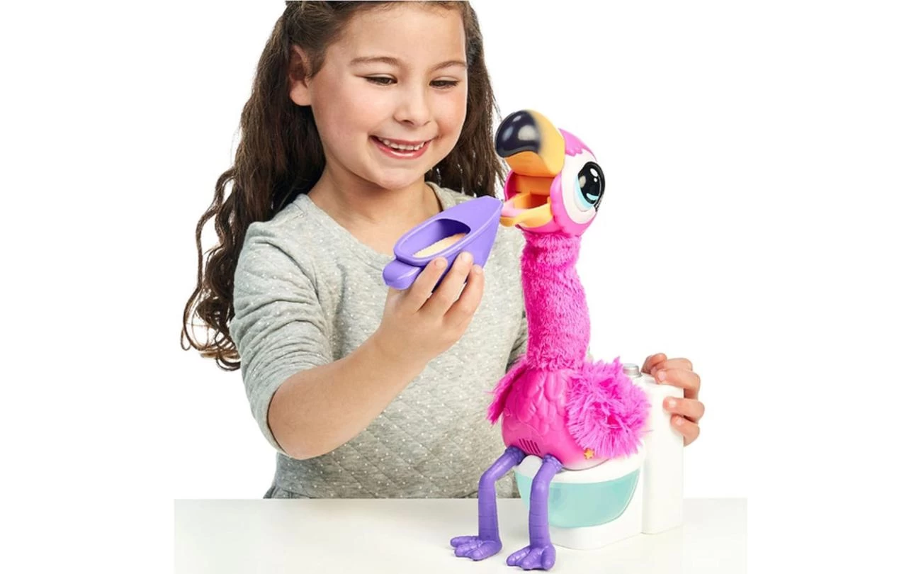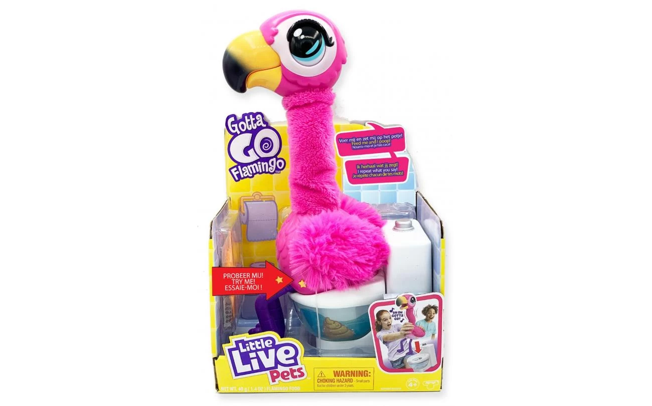 GottaGo Flamingo is een zachte pluchen Flamingo die je kunt voeren met zijn speciale Flamingo voer. Hij zal grappige smakgeluidjes maken en dansen op de muziek door met zijn nek te draaien. En zodra hij gaat zingen: Oh, oh, Gotta Go!, is dat het teken om hem snel op zijn WC te zetten, zodat hij zijn magische drolletjes kan leggen! De drolletjes verander je binnen een handomdraai weer in voer, zodat je hem keer op keer kunt voeren. Hij beweegt zijn lange nek ritmisch heen en weer en maakt allerlei geluidjes. Ook heeft hij een opname functie, zodat je teksten kunt inspreken, die hij voor je zal herhalen. Als je Gotta Go Flamingo een tijdje met rust laat, zal hij laten merken dat hij moe is en zal hij gaan slapen. Inclusief Flamingo voer, WC en voederlepel. Batterij informatie: 3 x AA batterijen (meegeleverd). Afmeting Flamingo: 13x10x33cm (lxbxh). Afmeting verpakking: 21x14x25cm (lxdxh). Leeftijdsindicatie: 4 jaar+.