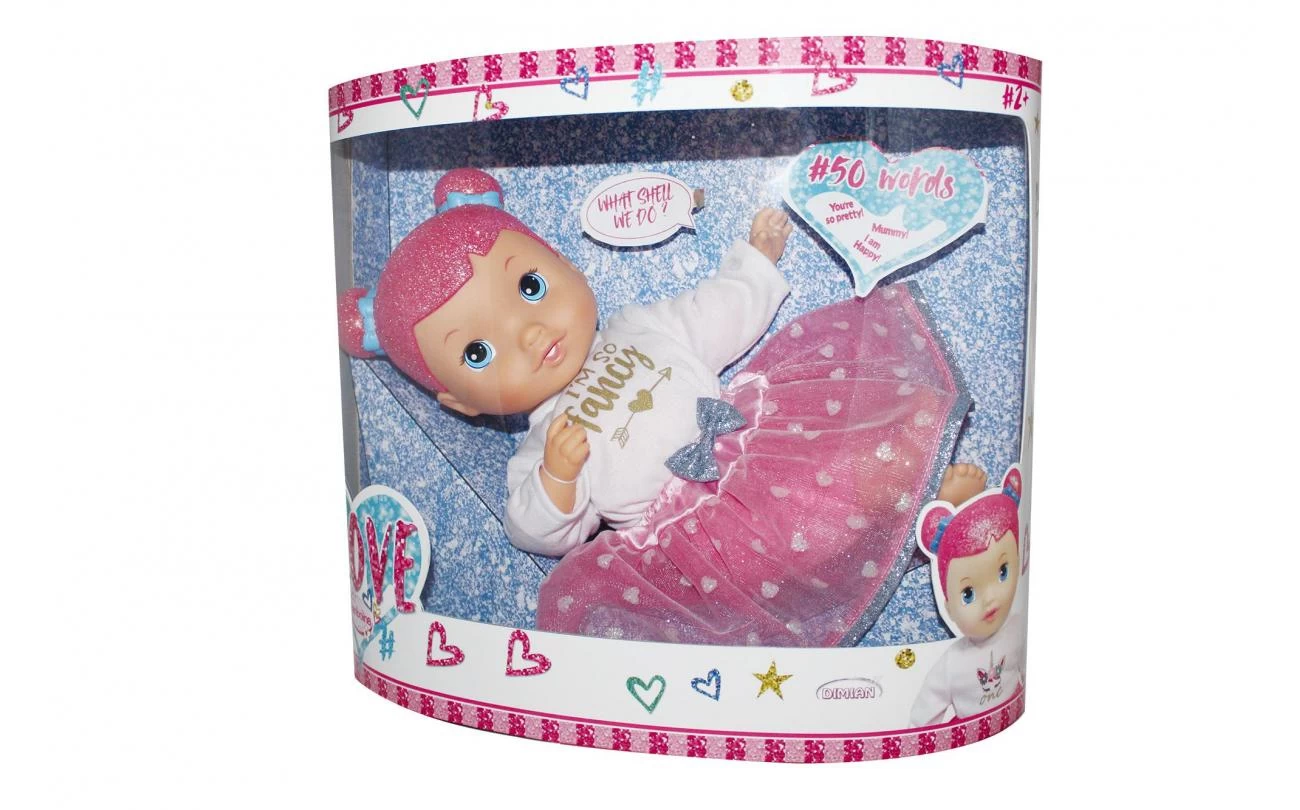 Glitterpop van 40 cm die 50 Nederlandse woordjes spreekt. De pop heeft prachtig geschilderde ogen, veel glitter en draagt een superleuke outfit.