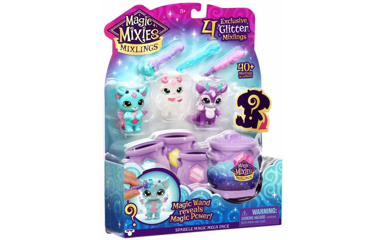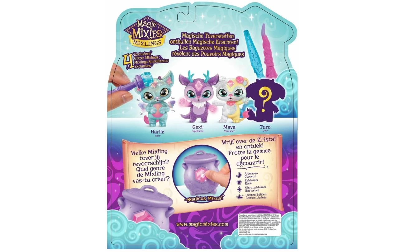 Het Magisch Glitter Mega Pack bevat 3 glinsterende Mixlings met Magische Toverstaf én in de Magische Ketel bevindt zich nog 1 mysterieuze sprankelende Mixling! Harlie is een Vlieger – tik met je toverstaf op zijn edelsteen en hij zal zijn prachtige vleugels onthullen. Gexi is een Tovenaar – gebruik je toverstaf om haar te zien oplichten! En Mava is een Vanisher – deze Mixling kan onzichtbaar worden! Wrijf over de edelsteen op de Ketel om te ontdekken of er een normale, zeldzame, ultra-zeldzame of Limited Edition Mixling in de Ketel zit. Wie tover jij uit de Ketel tevoorschijn?
