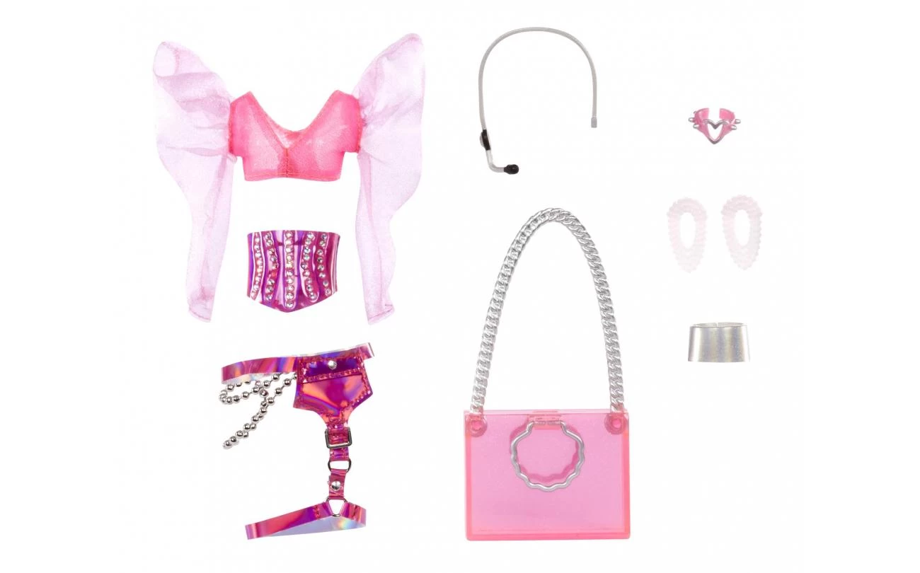 - OUTFITS EN ACCESSOIRES: Harmonique draagt een opvallende top met pofmouwen en een lijfje met metallic glittersteentjes. Haar accessoires zijn een headset, metallic riem, handtas, halsbandje en oorbellen