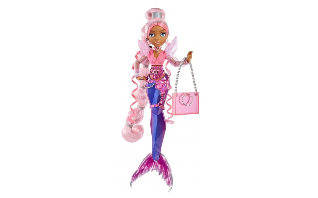 - INHOUD: buigzame zeemeermin modepop met van kleurveranderende staart, top, lijfje, riem, halsbandje, oorbellen, handtas en headset