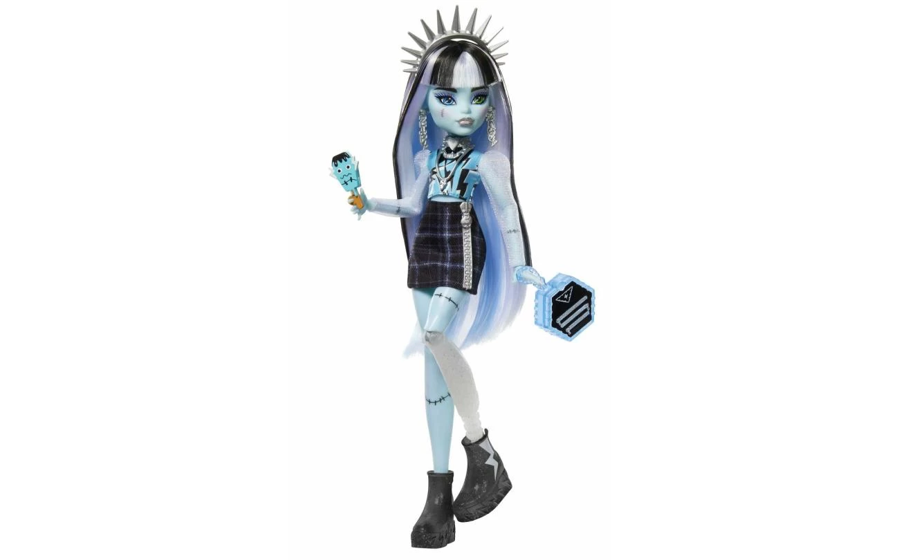 - Frankie Stein heeft een bot geknipte pony, metallic lippen en een glimmend bionisch been. Haar knetterende outfits passen bij haar unieke afkomst als monster en kun je op allerlei manieren combineren!