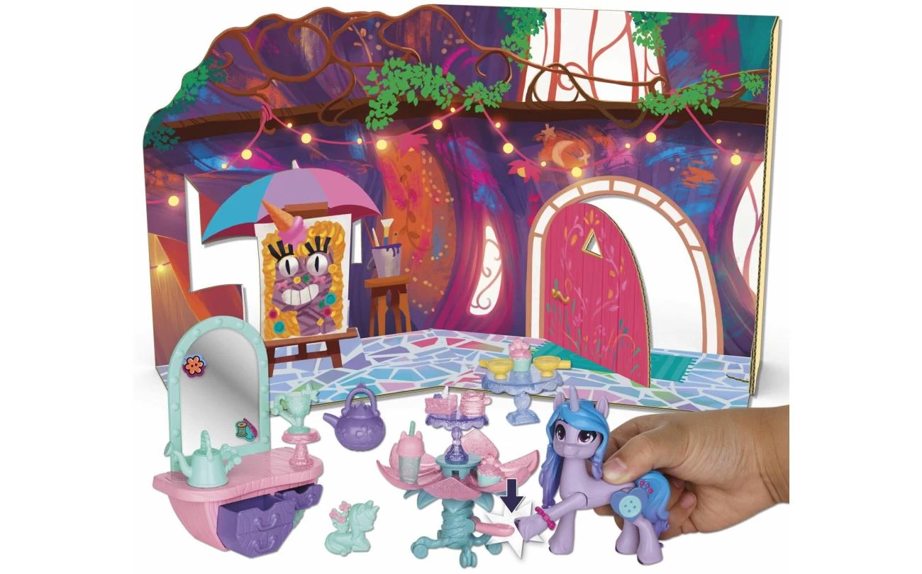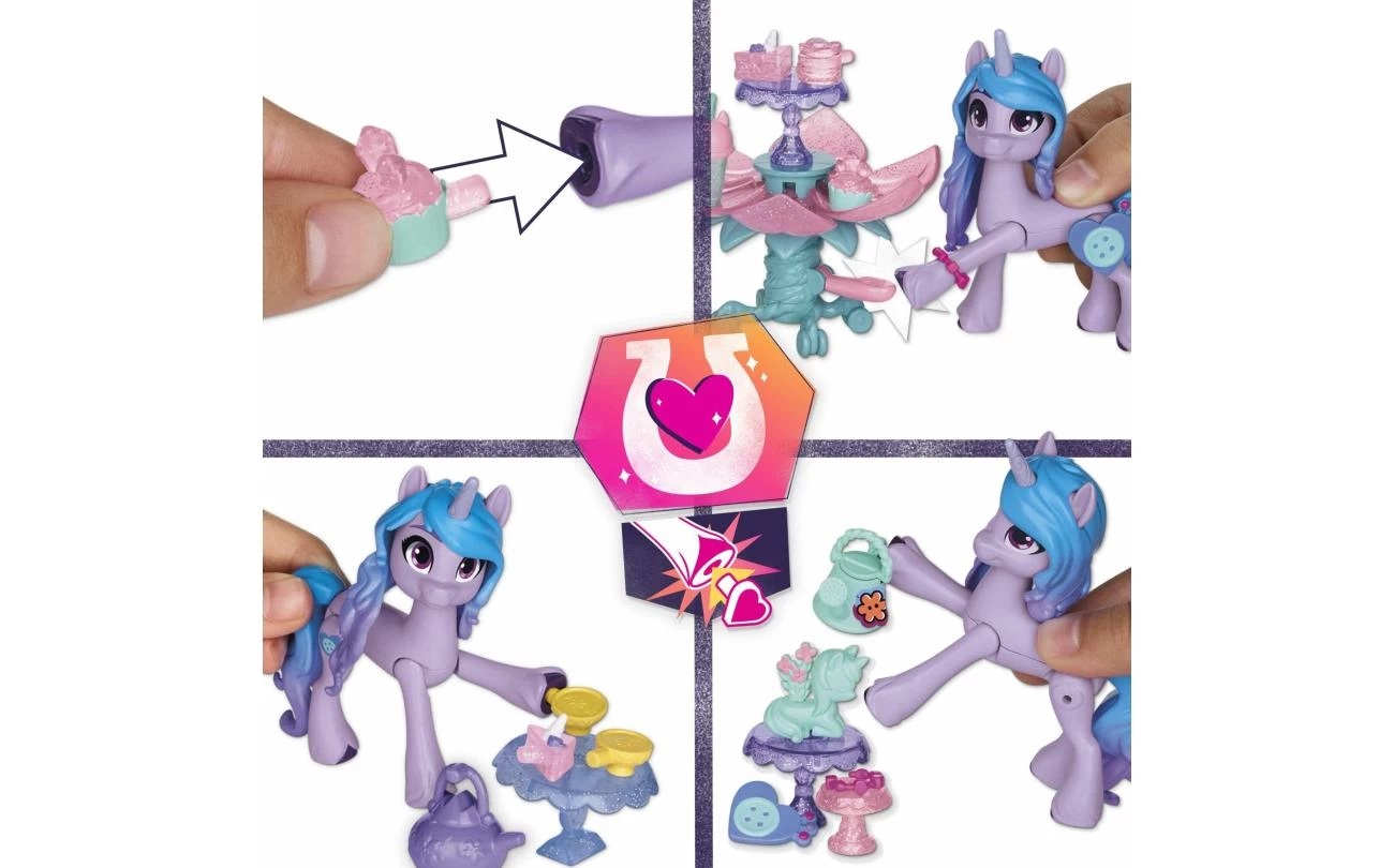 Laat zien wie je bent met Izzy Moonbow: een eenhoorn uit het Breidelwoudbos! Izzy is een energieke optimist die dol is op knutselen, creëren en sparkles, geïnspireerd op de film My Little Pony: A New Generation en de serie My Little Pony: Make Your Mark. Met een beweegbare Izzy Moonbow-ponyfiguur van 7,5 cm met plastic manen en staart. Figuur heeft een hartvormige knop als cutie mark aan de ene kant en een insteekbare cutie mark-amulet voor de andere kant! Met 20 onderdelen, inclusief hoef op het hart-accessoires die in haar hoef kunnen! En met een papieren verhaalscène als achtergrond voor haar eenhoorn-slaapkamer. Zet haar waterflesje en plant op haar kaptafel en vul de tafel met spullen voor het theefeestje. Tafel heeft hoef op het hart-activering — druk met Izzy’s hoef op het pedaal om het van een bloem te veranderen in een open tafel! Tot slot decoreer je de scène en accessoires met stickers. Een ideaal cadeau voor verjaardagen of feestdagen, voor kinderen vanaf 3 jaar.
