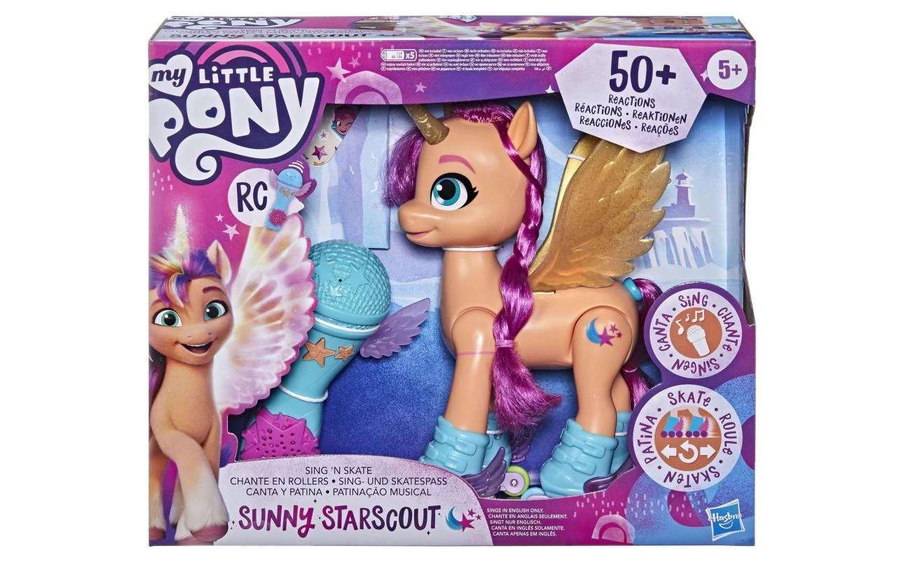 Leer de pony Sunny kennen: Een avontuurlijke pony uit Maretime Bay! Zingende en Skatende Sunny is een interactieve speelfiguur die kinderen zelf kunnen besturen. Deze My Little Pony speelset is inclusief een draadloze microfoon waar je in kunt zingen en die tevens als afstandsbediening gebruikt kan worden. Gebruik de knoppen op de microfoon om de pony vooruit te laten bewegen of haar rond te laten draaien. Kinderen kunnen de microfoon-afstandsbediening ook gewoon schudden om de pony te laten bewegen! De pony speelfiguur beweegt haar hoofd en vleugels terwijl ze schaatst en een deel van het liedje ‘Gonna Be My Day’ zingt. Het heeft meer dan 50 combinaties van licht, geluid en beweging. De 22,5 cm grote oranje pony heeft lang, zachtroze haar en een vallende ster aan de zijkant dat op het personage Cutie Mark geïnspireerd is. Alle fans, zowel nieuwe als oude, kunnen avonturen beleven met dit My Little Pony speelgoed dat geïnspireerd is op de film My Little Pony: A New Generation