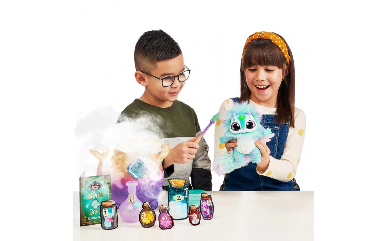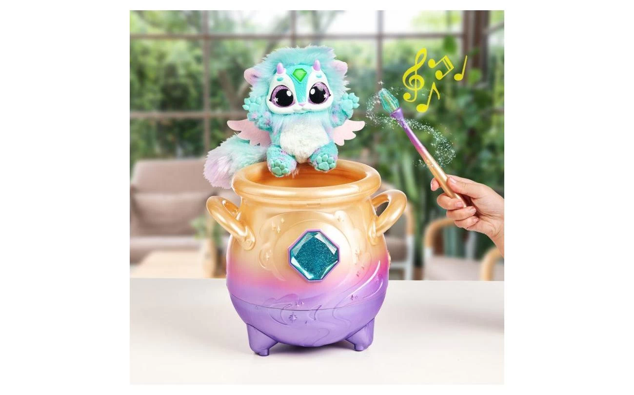 Ervaar échte magie met de Magic Mixies Magische Ketel! Wie tover jij op Magische wijze uit de Ketel tevoorschijn? Je Ketel wordt geleverd met een speciale Toverstaf en alle magische ingrediënten die je nodig hebt om een toverdrankje te mixen, waaruit je eigen schattige, interactieve vriendje zal ontstaan! Voeg stap voor stap alle magische ingrediënten, zoals de kristallen edelsteen en de magische veer, toe aan je Ketel. Na elke stap zal de Ketel het ’tik tik tik’ signaal geven. Tik dan 3 keer met je toverstaf op de ketel en de Ketel zal reageren met groen licht en verschillende geluiden. Je zult versteld staan hoe uiteindelijk je pluchen Mixie uit de ECHTE mist tevoorschijn komt.
