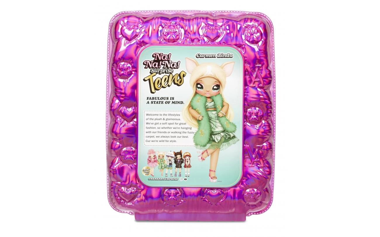 Na Na Na Surprise Teens zijn prachtige, zachte modepoppen van 28 cm met heel veel persoonlijkheid en een glamourstijl. Deze pop heet Carmen Linda en is geïnspireerd op een chihuahua.