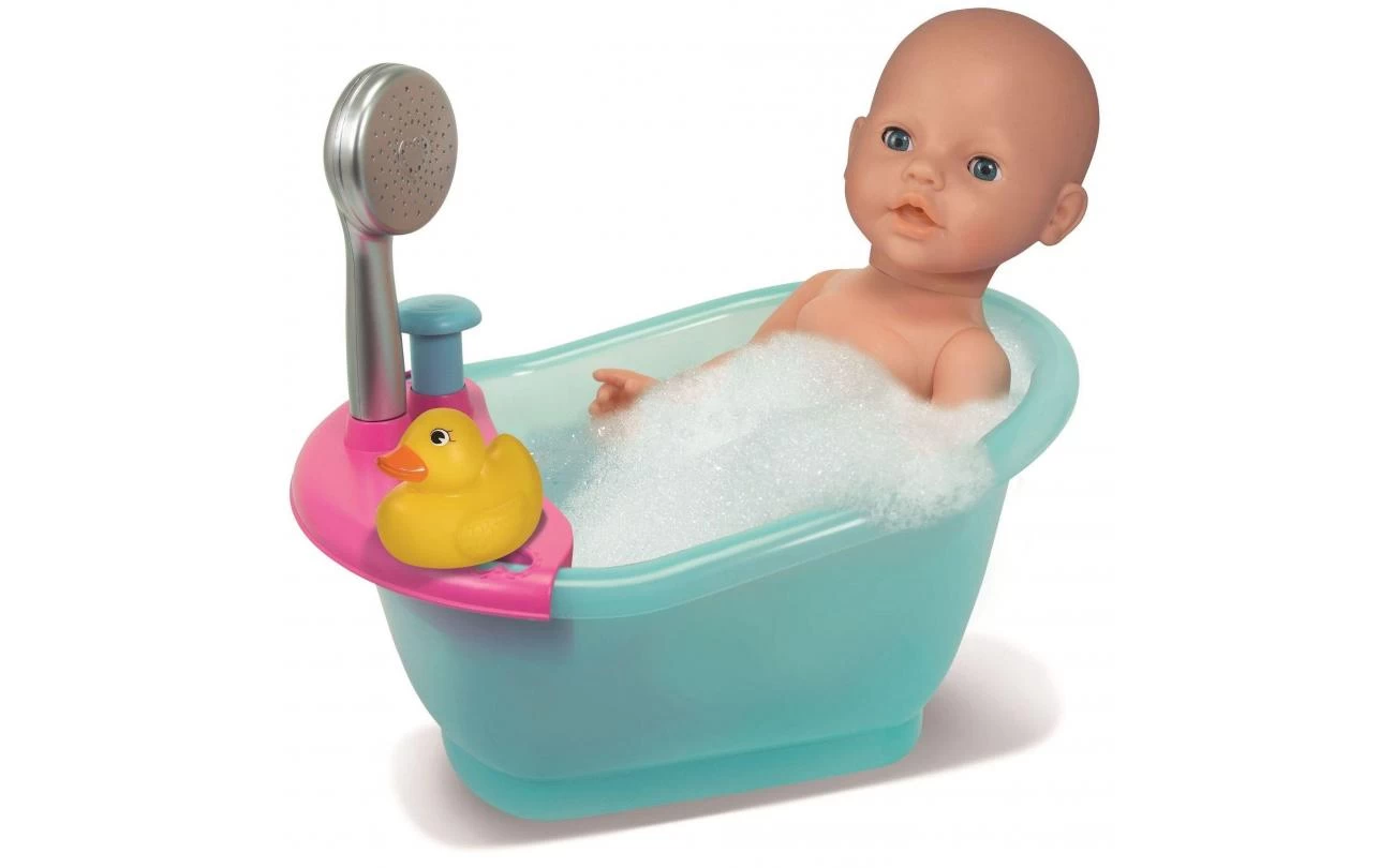 Alle 30-43 cm hoge poppen kunnen rondspetteren in de badkuip van New Born Baby. Met een druk op de blauwe knop wordt het water door de sproeikop gepompt en kunnen alle kinderen hun poppen eens grondig wassen. Het bad is 32,5 cm lang en geschikt voor kinderen vanaf 3 jaar.