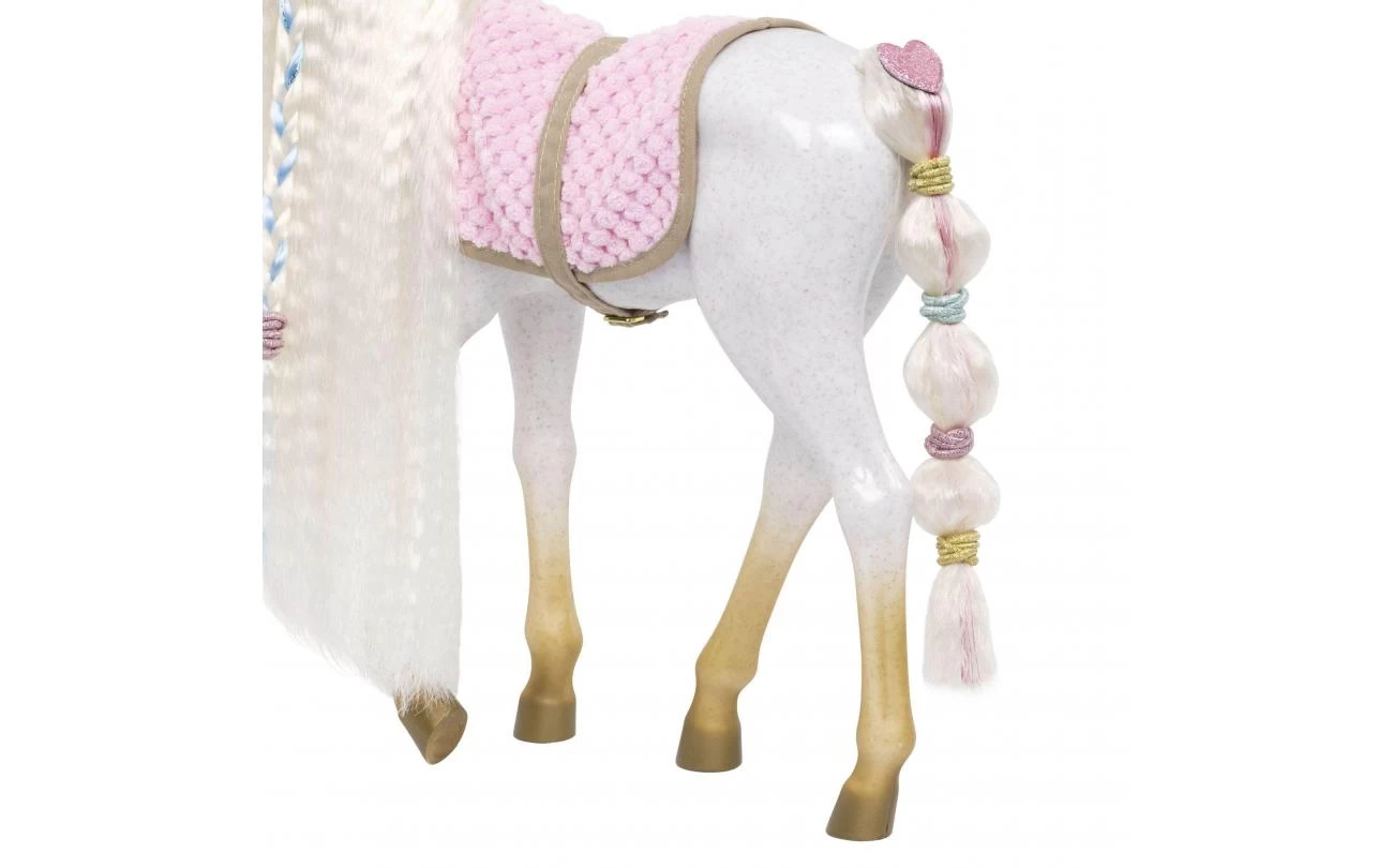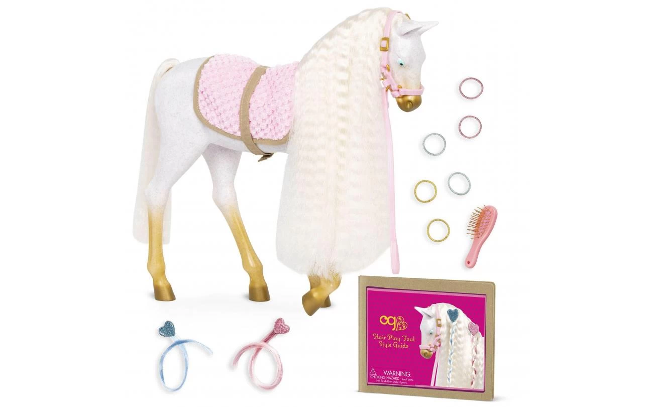 Laat je creativiteit de vrije loop met het Our Generation Andalusian Hair Play Veulen! Dit stylingpaard heeft een wit lichaam met gouden hoeven, ultralange witte manen en staart om de prachtige kapsels mee te maken.