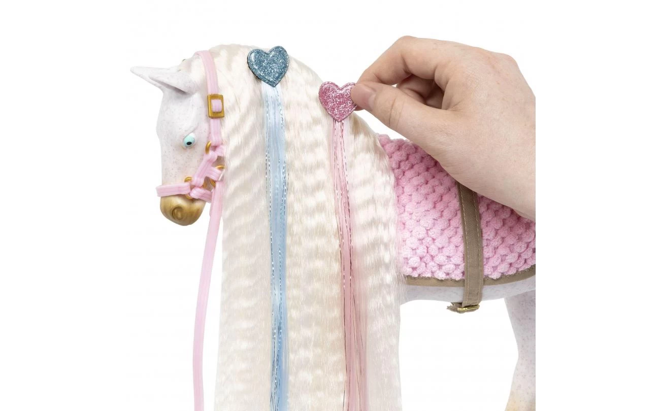 Begin met het borstelen van de manen en staart en voeg de hartvormige hair extensions toe. Ze klemmen gemakkelijk aan de manen of staart van het paard!