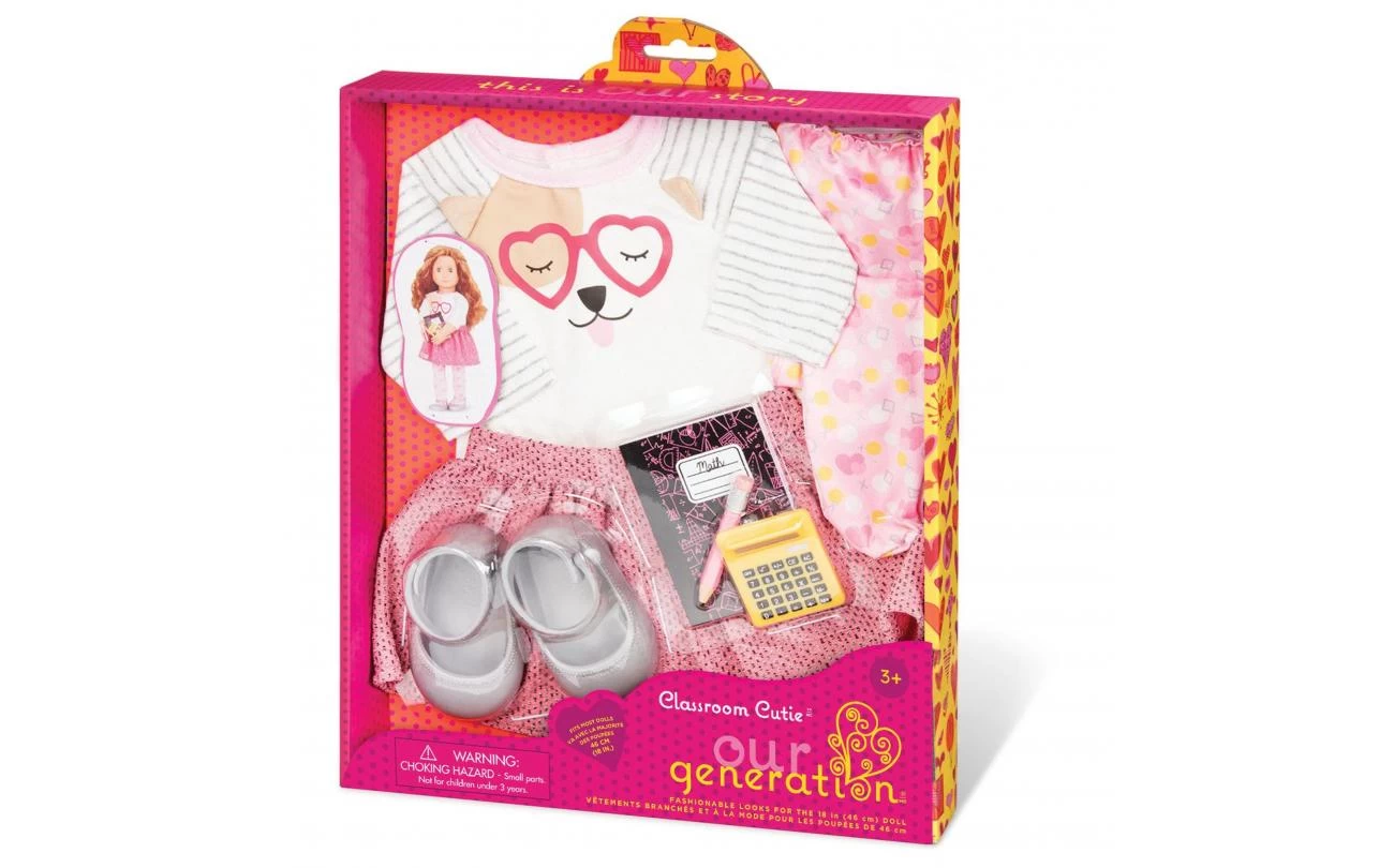 Deze schattige school-outfit heeft een oogverblindend mooie rok, bijpassende roze legging een schattig shirt met lange mouwen. De andere leerlingen in het Our Generation klaslokaal zullen zich afvragen waar je hem vandaan hebt! Bij deze outfit zitten ook tal van schoolspullen zoals een notitieboekje, potlood en rekenmachine, dus je bestie zal zonder problemen haar werk afmaken voor jullie kunnen gaan spelen!