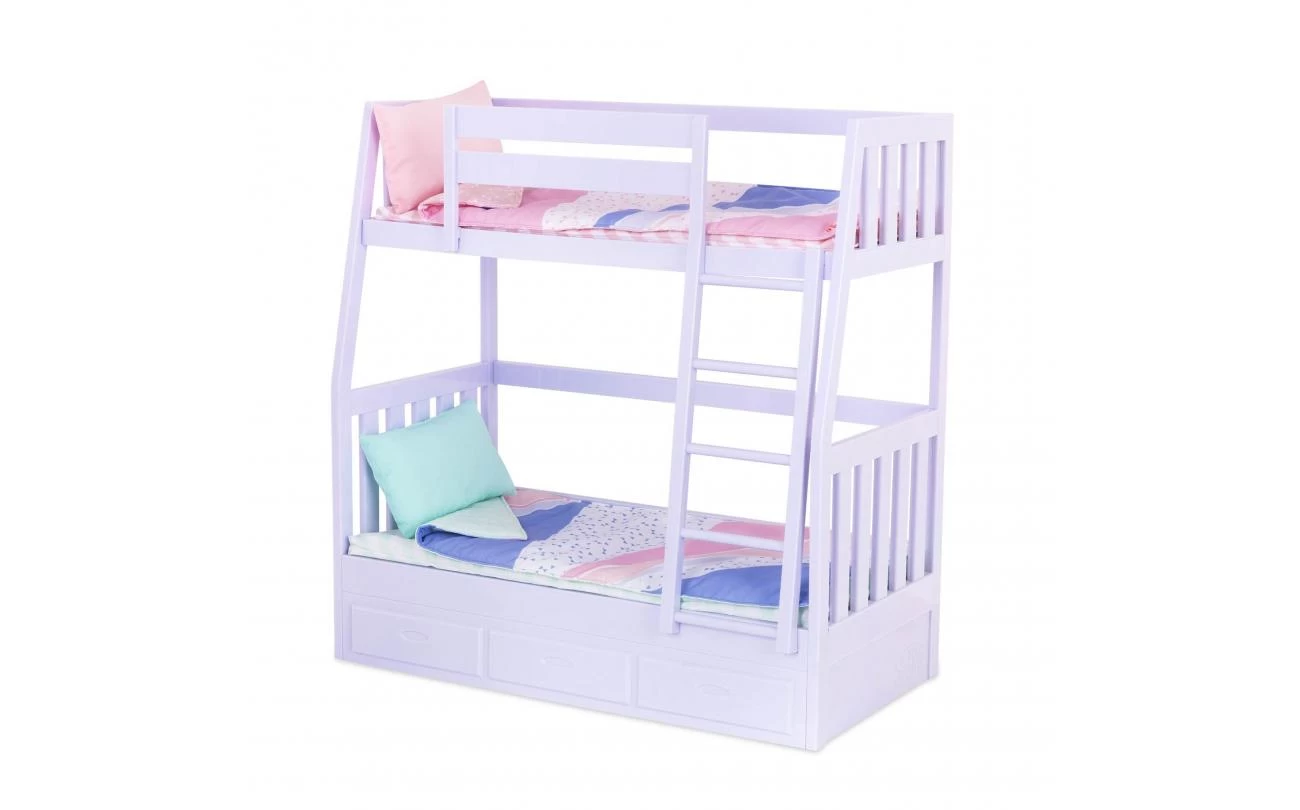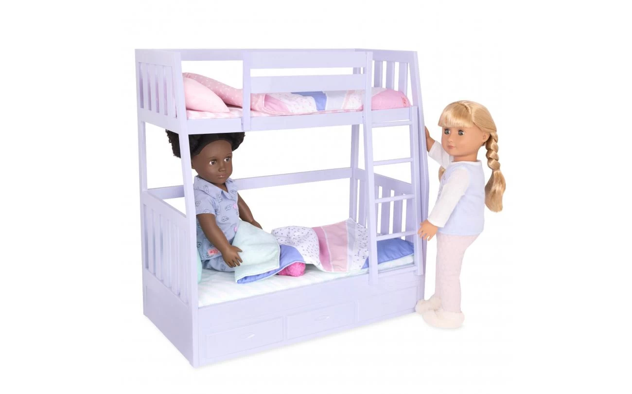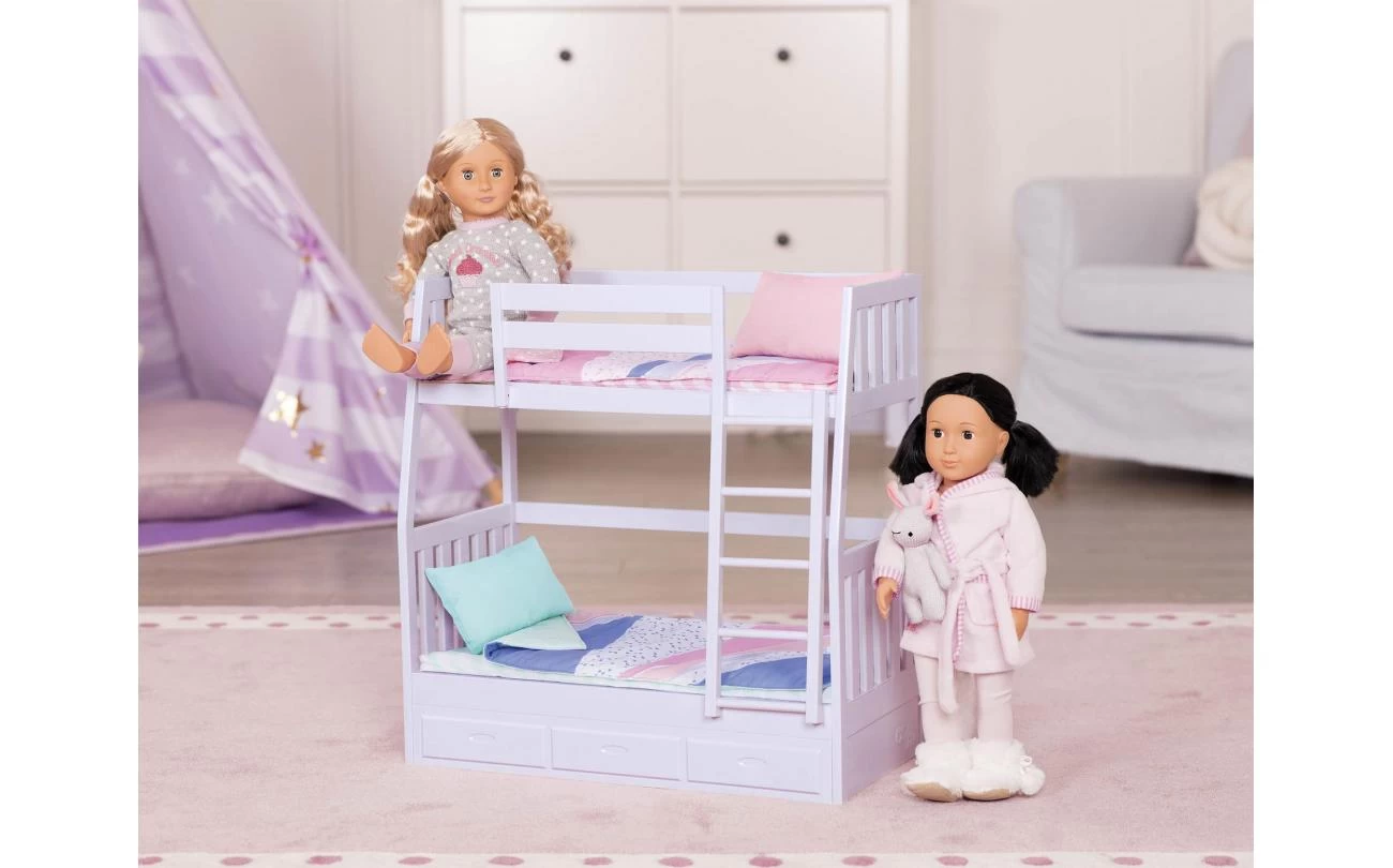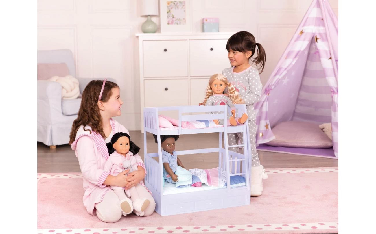 Comfortabel wit stapelbed speciaal ontworpen voor Our Generation poppen, prima geschikt voor het organiseren van een slaapfeestje.