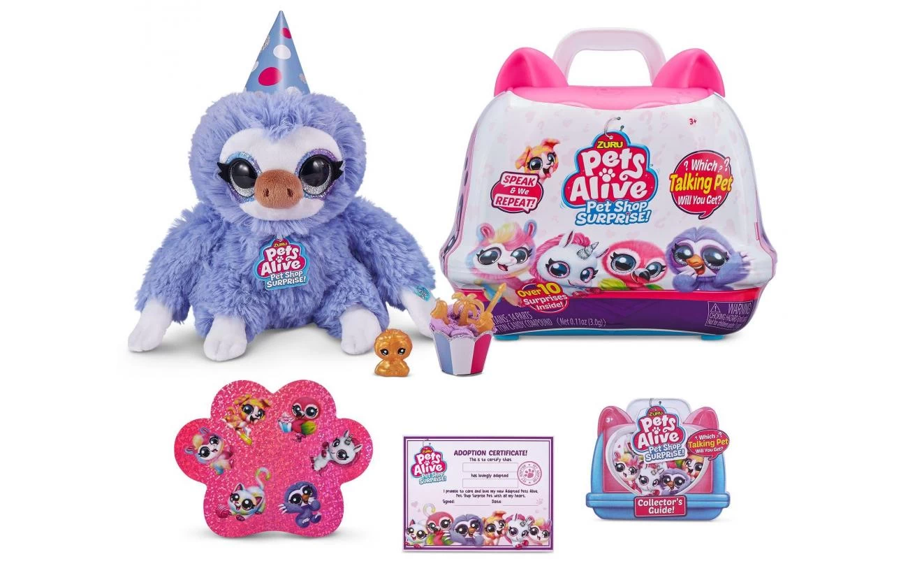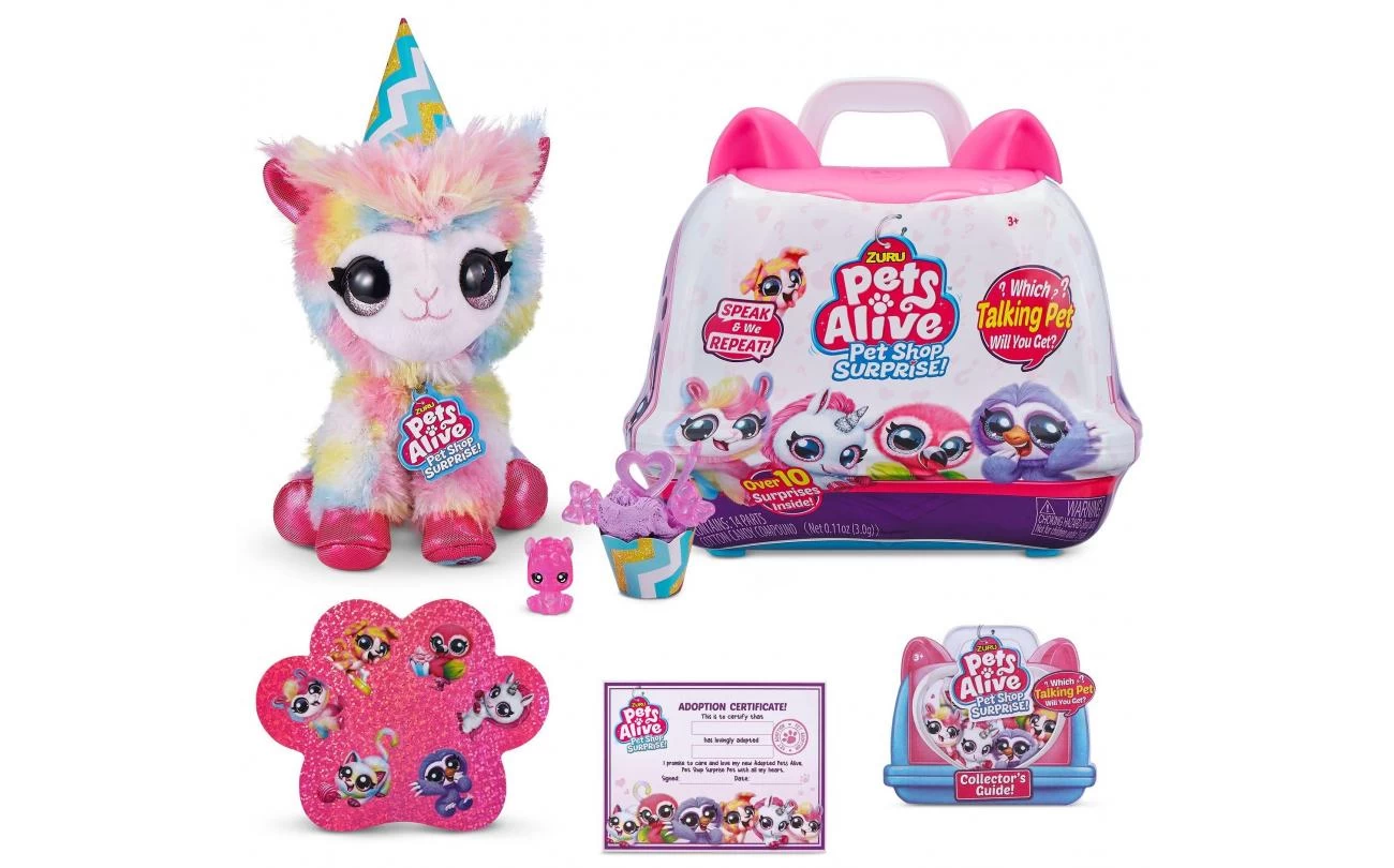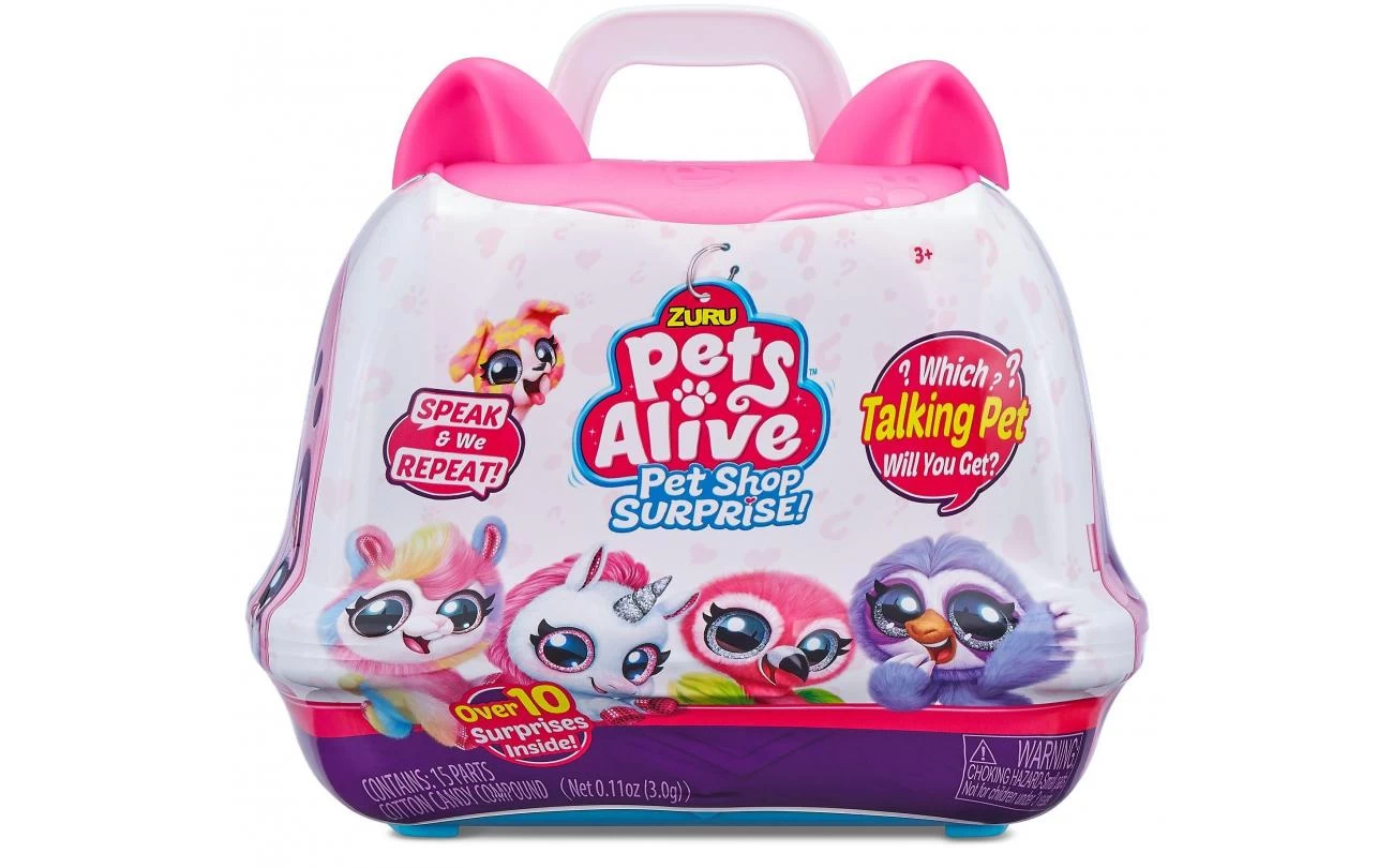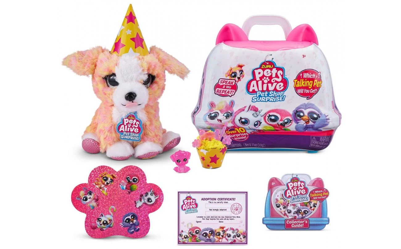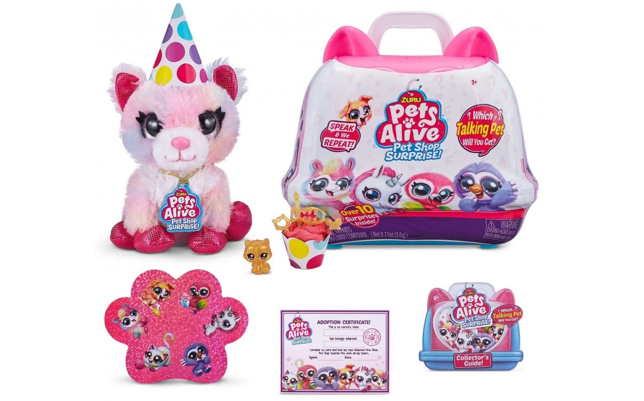 Pets Alive Pet Shop Surprise is het ultieme nieuwe huisdier om te adopteren! Met Speak & Repeat, dierengeluiden en meer dan 10 verrassingen, zijn deze huisdieren de perfecte nieuwe bestie om mee te knuffelen! Open je koffer om te laten zien welk huisdier je hebt geadopteerd en vier de adoptie met alle feestverrassingen erin! Maak een zelfgemaakte feestmuts, een cupcake-doosje en vul het dan met suikerspinmengsel en versier het met accessoires! Er is zelfs een potloodtopper voor baby’s! Er zijn 6 huisdieren om te verzamelen, waaronder een kat, puppy, flamingo, luiaard, lama en eenhoorn! Welk huisdier wordt je nieuwe geadopteerde bestie ?!