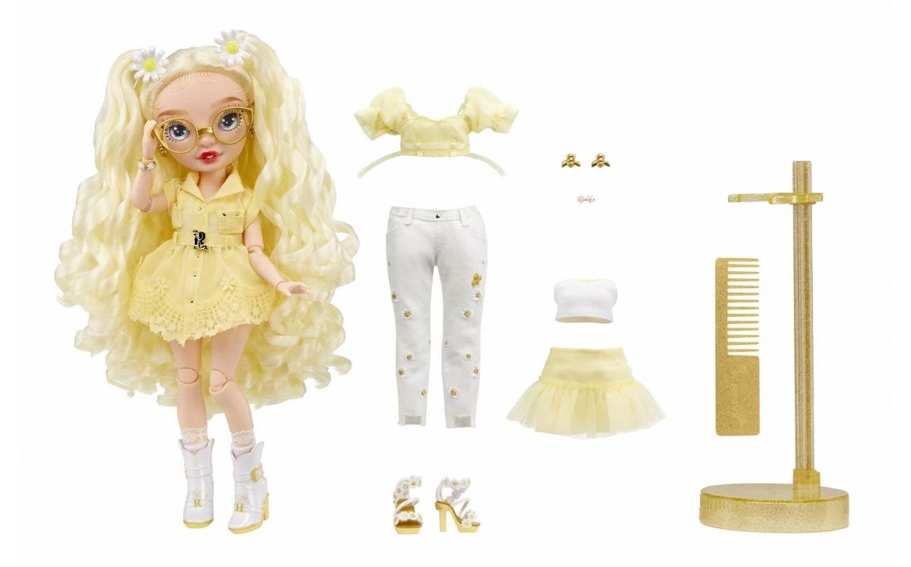 - SCHITTERENDE KENMERKEN: Delilah Fields heeft een uniek ontwerp en is van top tot teen gekleed in het BOTERBLOEM GEEL. Delilah is onze eerste pop met albinisme en ook onze eerste pop met witte wimpers en stijlvolle bril op sterkte. Haar mode is voorzien van schitterende details en ze heeft prachtig gekruld haar met haarringen, lange wimpers en glazen ogen. Verzamel een regenboog aan adembenemend mooie Rainbow High-modepoppen