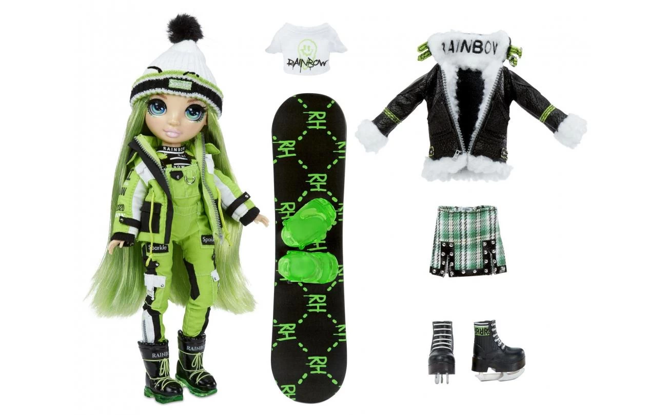 De 6 oorspronkelijke modepoppen krijgen een winterse make-over, zodat ze megamodieus de pistes kunnen afglijden met hun vrienden en vriendinnen. Elke modepop is gekleed in haar lievelingskleur en heeft haar eigen unieke stijl die je terugziet in haar outfits en wintersportuitrusting. Met deze speelset kunnen kinderen eindeloos veel fantasievolle en creatieve verhalen verzinnen voor urenlang speelplezier. Deze wintersportvakantie-speelset is inclusief modepop, 2 complete poppenoutfits, 2 paar poppenschoenen, onmisbare poppenaccessoires zoals snowboots, beanie en snowboard met echt werkende bindingen en kam. Je kunt het snowboard ook gebruiken als poppenstandaard met winterthema. Trek haar elke look aan of mix en match de trendsettende mode die haar op en buiten de pistes warm houdt. Ze is volledig beweegbaar en poseerbaar. Je kunt haar laten poseren en met haar spelen op het snowboard. Het snowboard is ook een poppenstandaard waarmee je je pop tentoon kunt stellen. Bekijk de animatieserie op YouTube en Netflix! Zoek op ‘Rainbow High Dolls’. Verzamel de regenboog! 6 Wintersportvakantie-modepoppen: Ruby Anderson, Poppy Rowan, Sunny Madison, Jade Hunter, Skyler Bradshaw en Violet Willow.