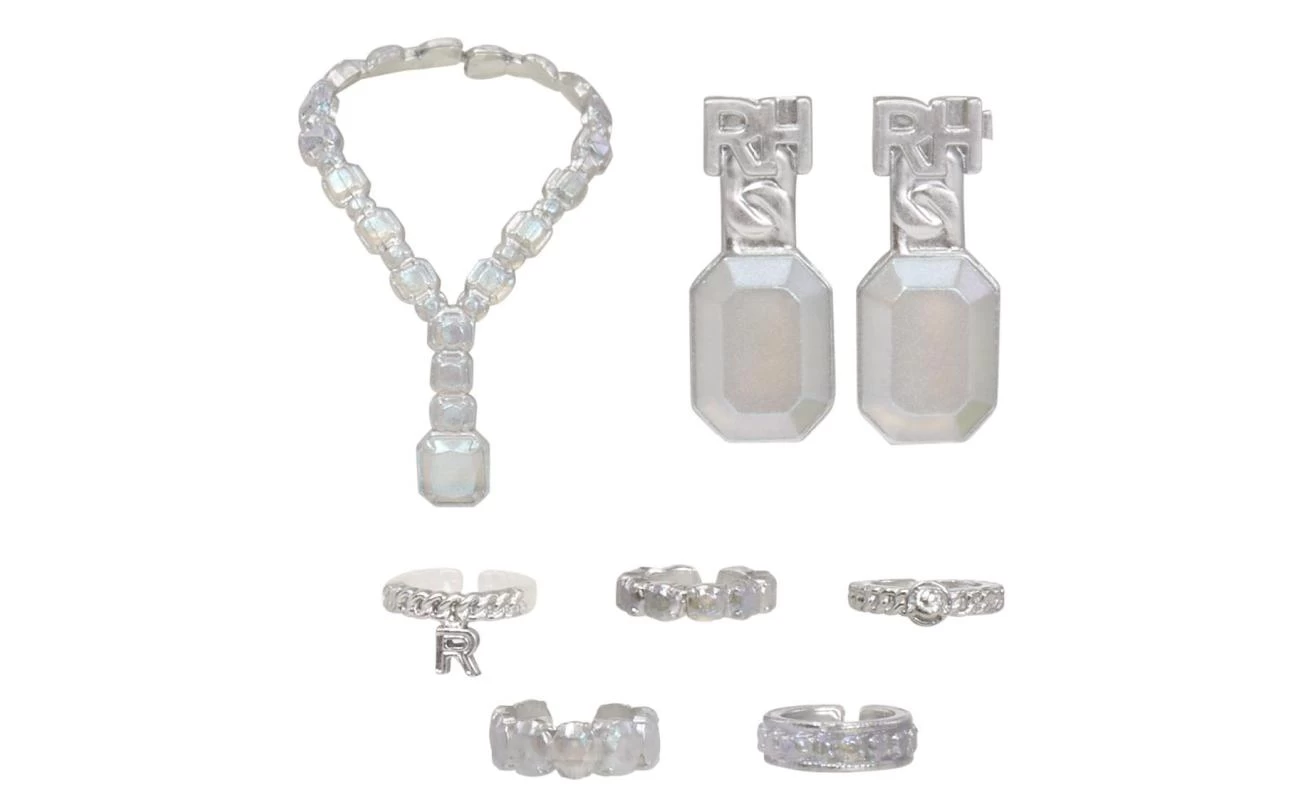 - STYLINGACCESSOIRES: Roxie is slim en een persoonlijkheid waar je niet omheen kunt. Ze draagt sieraden om jaloers op te zijn: zes armbanden met allerlei verschillende vormen en kleuren diamanten, een paar oorbellen met diamanten in een smaragdslijpsel en met een RH-logo en een diamanten halsketting met een ‘cushion cut’-diamant. Perfect voor mix- en matchplezier