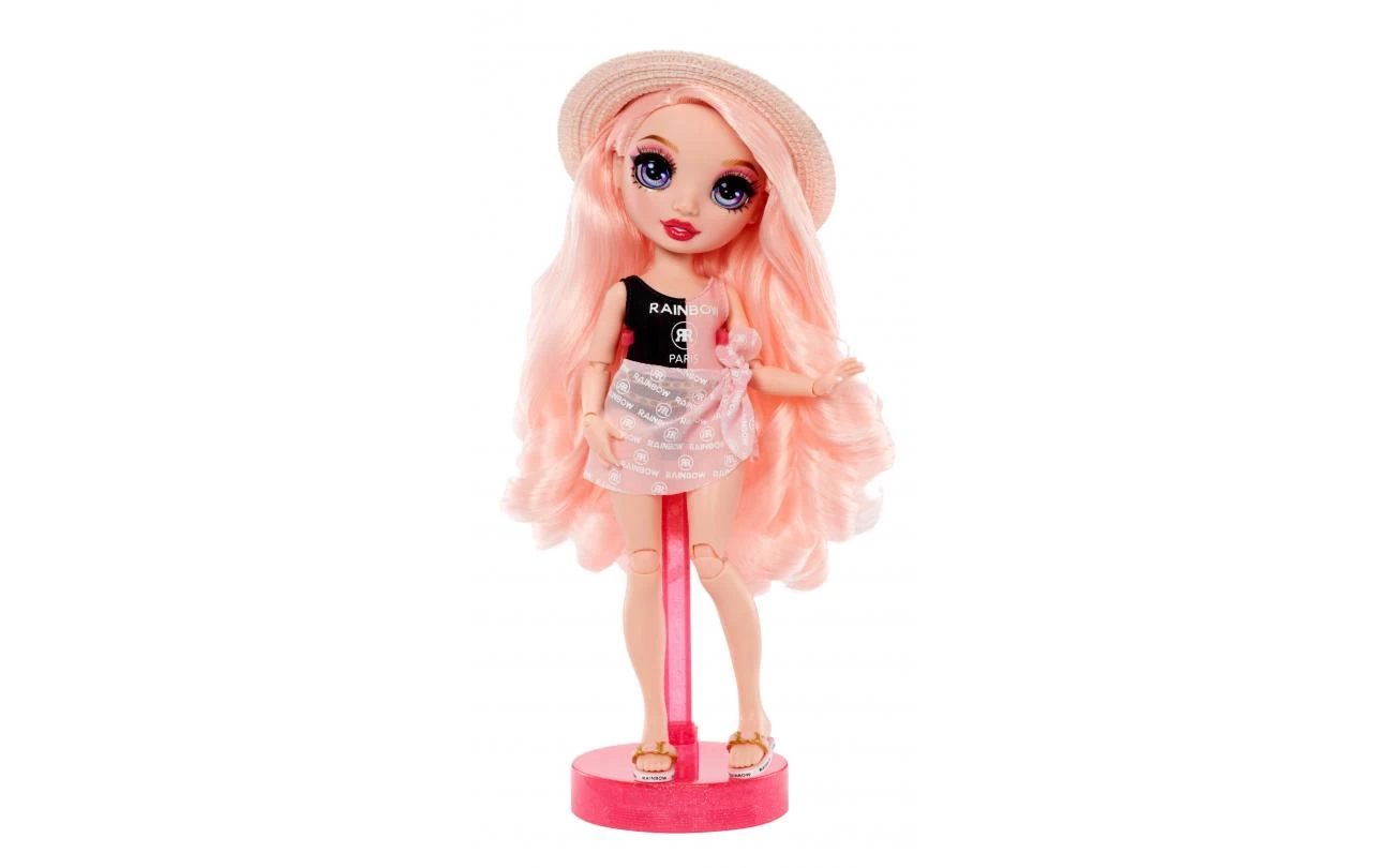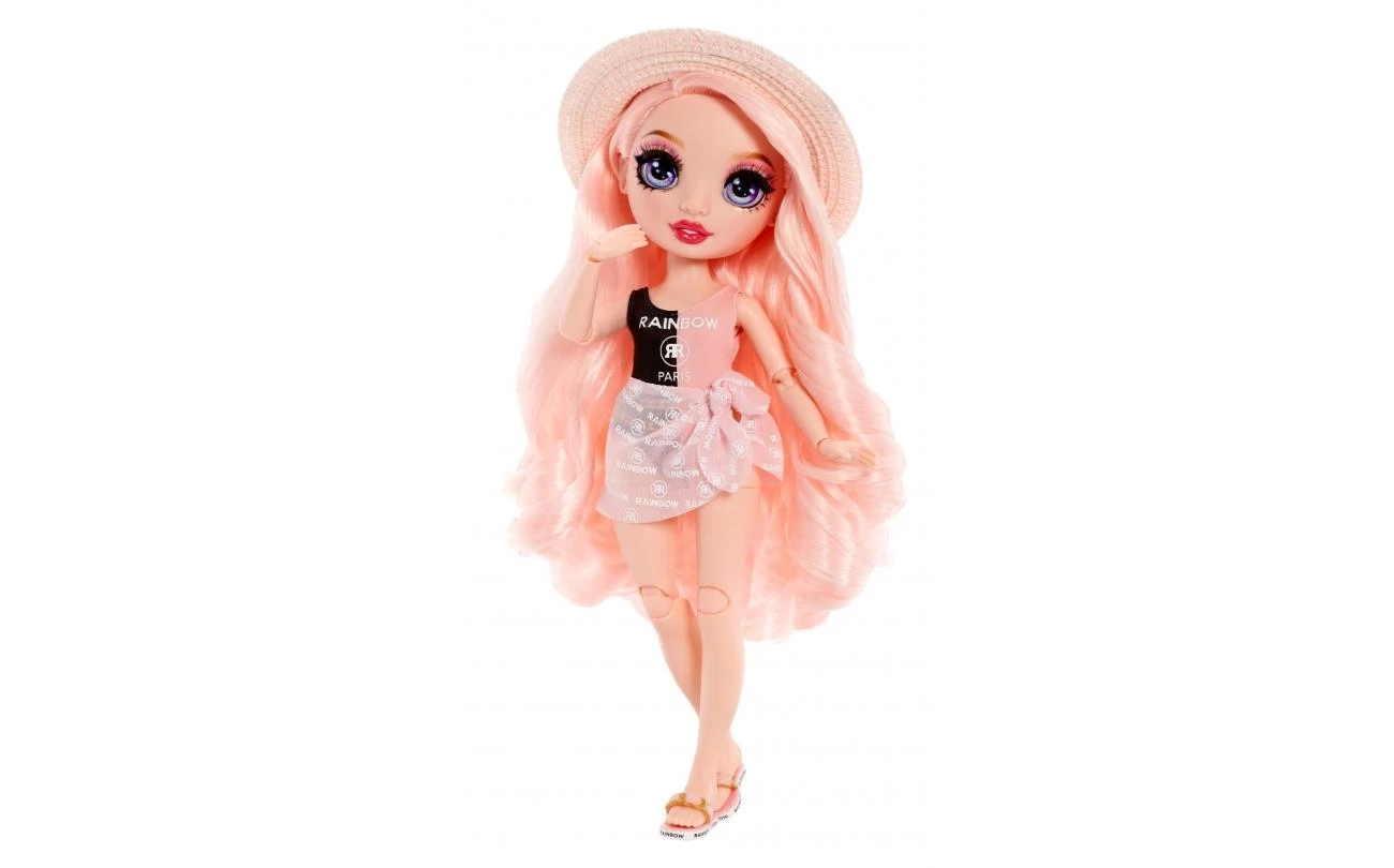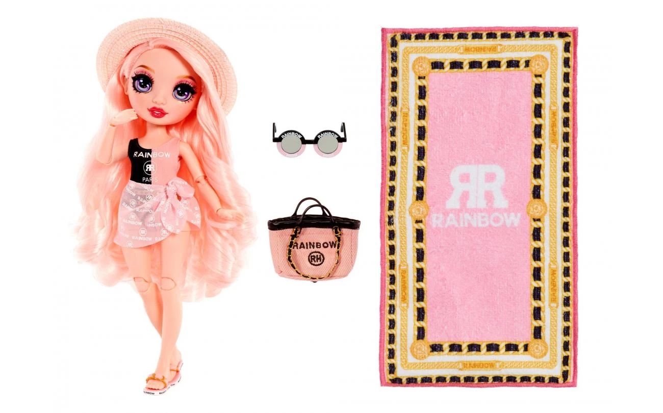 Rainbow High stimuleert creativiteit: Maak kennis met de leerlingen van Pacific Coast, de chique middelbare school voor de kunsten aan de westkust. De dagen zijn hier zonnig en de lessen worden aan het zwembad gegeven. Elke speelset met thema wordt geleverd met een complete poppenoutfit, kenmerkende onontbeerlijke accessoires voor het zwembad en verwisselbare benen. Bella Parker ziet er schitterend uit en is van top tot teen chic gekleed in het roze. Haar mode is voorzien van schitterende details en ze heeft prachtig lang ROZE haar dat golft, lange wimpers en glazen ogen. Verzamel een regenboog aan adembenemend mooie Rainbow High-modepoppen. Als extra’s heeft ze verwisselbare benen die buigen hij de knieën en binnen een mum kunnen wisselen van sandalen naar hoge hakken. Bella is nu klaar voor elke gelegenheid. Van een wandeling over het zandstrand tot een smoothie bij de bar. (Hoge hakken niet inbegrepen, maar alle schoenen met hoge hak van de Rainbow High-modepoppen passen). Bella is een natuurlijke leider op Rainbow High, het is dus geen verrassing dat ze al nieuwe vrienden heeft gemaakt op Pacific Coast High. Ze is nog altijd een perfectionist, dus ook haar zwembadoutfit is om door een ringetje te halen. Ze draagt een prachtig tweekleurig badpak met schakelkettingprint, verwijderbaar rokje van chiffon, sandalen met gouden kettinkjes en heeft verder alle noodzakelijke zwembadspullen bij zich.