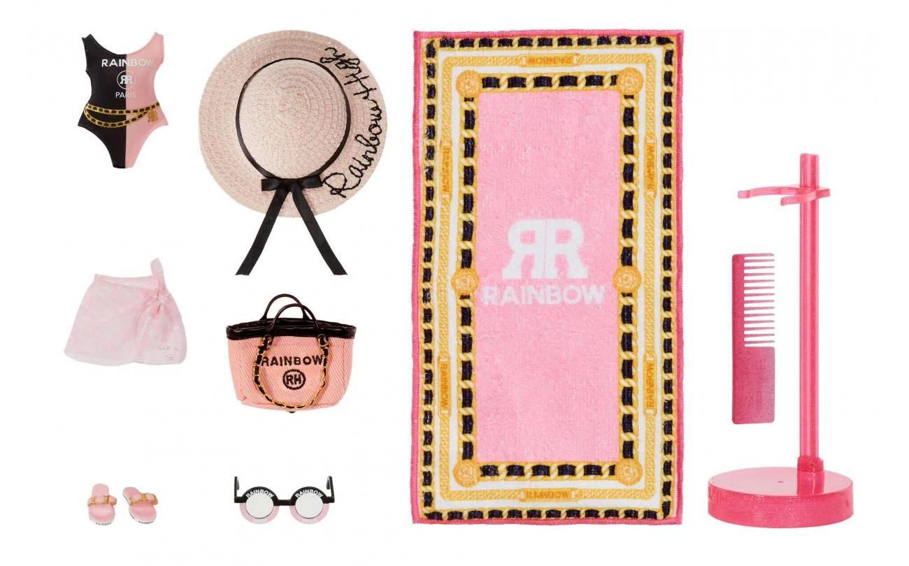 - ZWEMBADMODE – Bella is een natuurlijke leider op Rainbow High, het is dus geen verrassing dat ze al nieuwe vrienden heeft gemaakt op Pacific Coast High. Ze is nog altijd een perfectionist, dus ook haar zwembadoutfit is om door een ringetje te halen. Ze draagt een prachtig tweekleurig badpak met schakelkettingprint, verwijderbaar rokje van chiffon, sandalen met gouden kettinkjes en heeft verder alle noodzakelijke zwembadspullen bij zich.