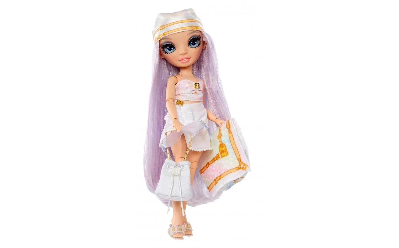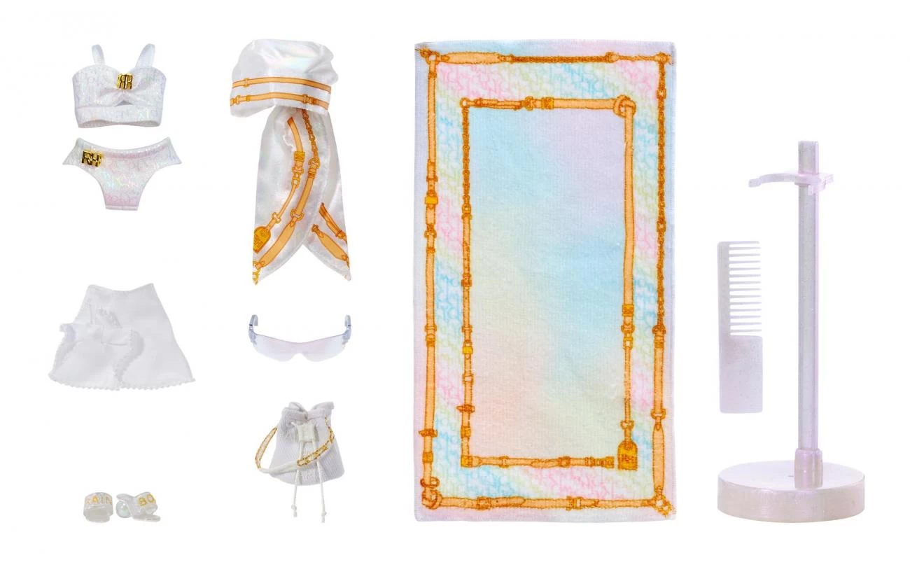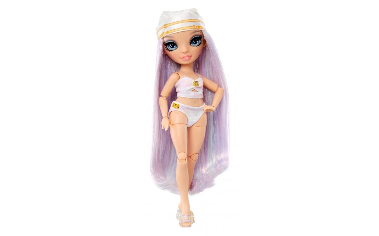 - ZWEMBADMODE: – Bij Margot draait het om de details, daarom is ze ook zo goed in het ontwerpen van sieraden. Ze voegt altijd iets sprankelends toe aan haar outfits. Ze draagt een bikini met print, met iriserende folie en Rainbow High-bedeltje, een verwijderbaar dun wikkelrokje met parelapplicatie, sandalen met parelhak, en heeft alle onmisbare accessoires voor aan het zwembad bij zich.