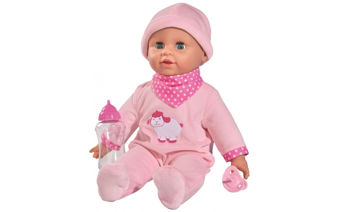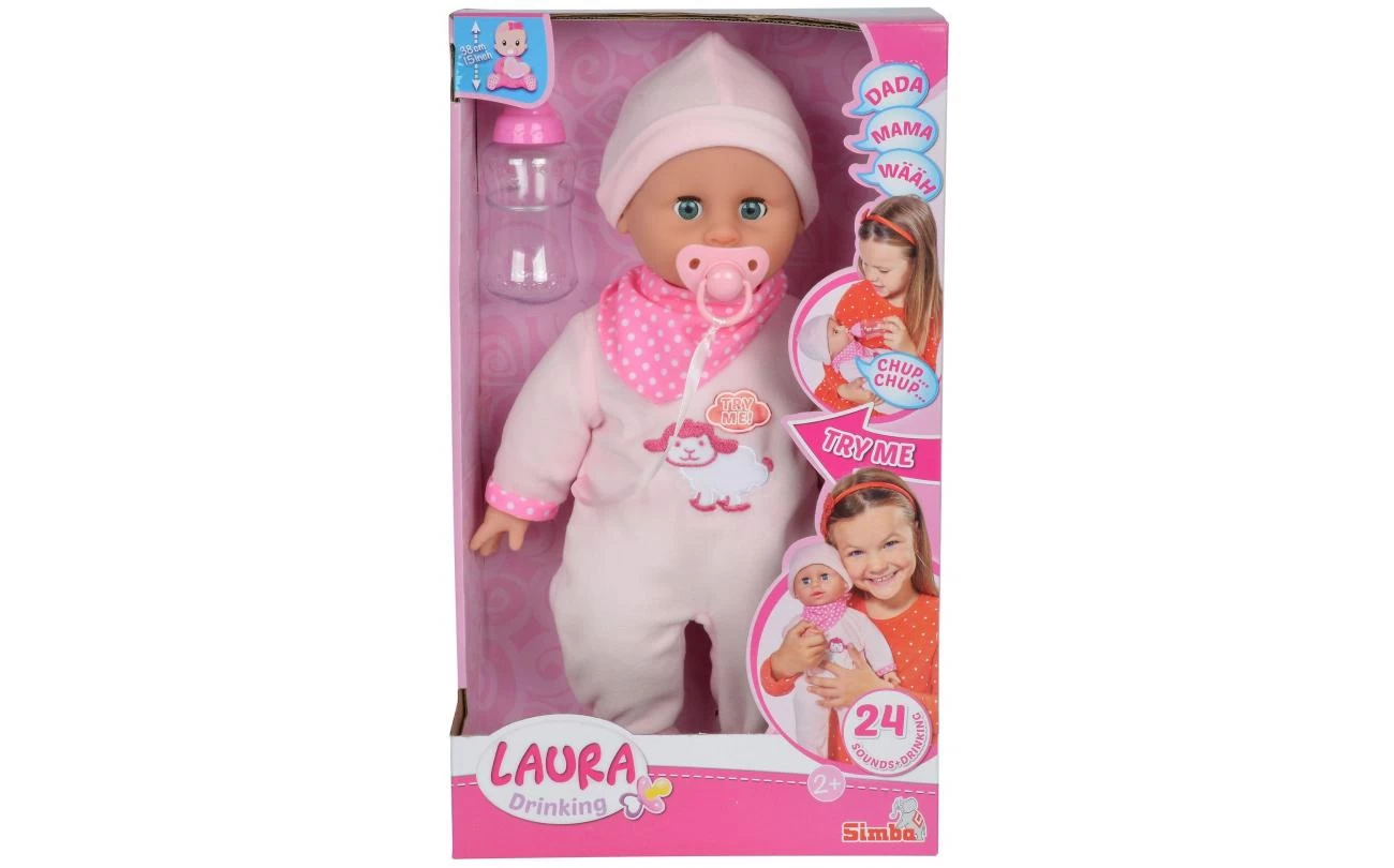 Laura is een zachte babypop met slapende oogjes van Nicotoy. Ze brabbelt 24 verschillende geluidjes en drinkt graag uit haar flesje. Als ze gedaan heeft met drinken, kan je haar fopspeen geven en lekker in bed leggen.