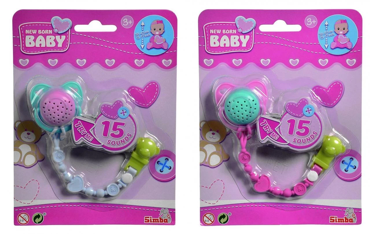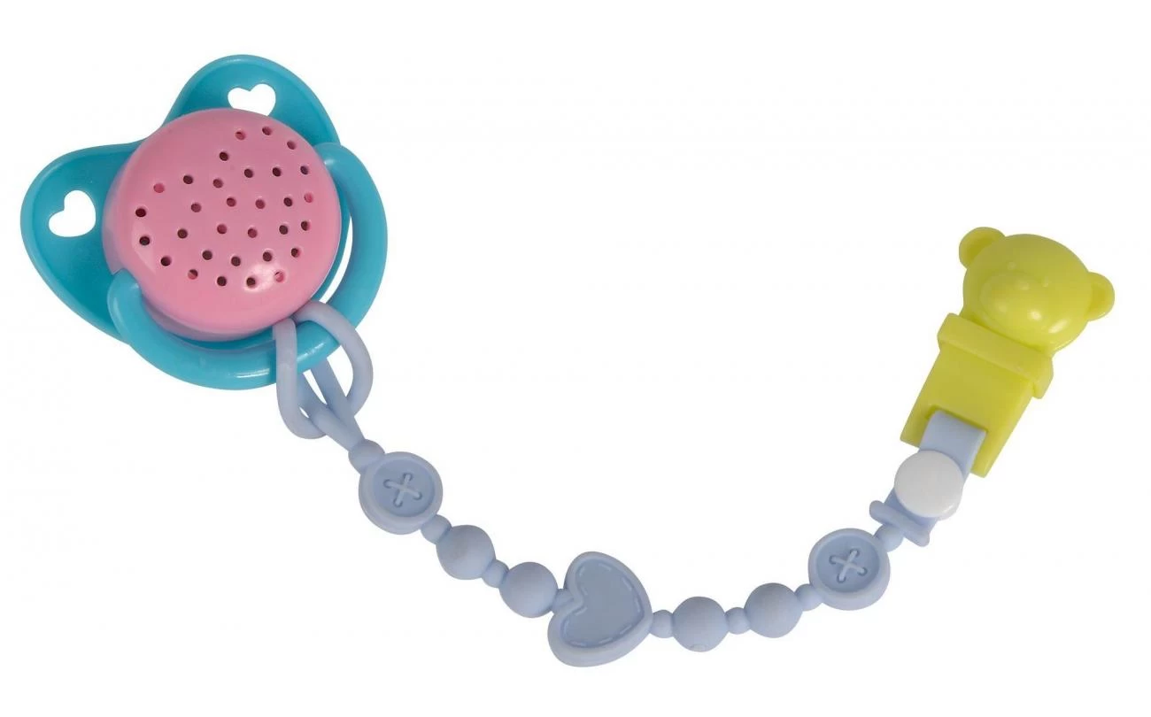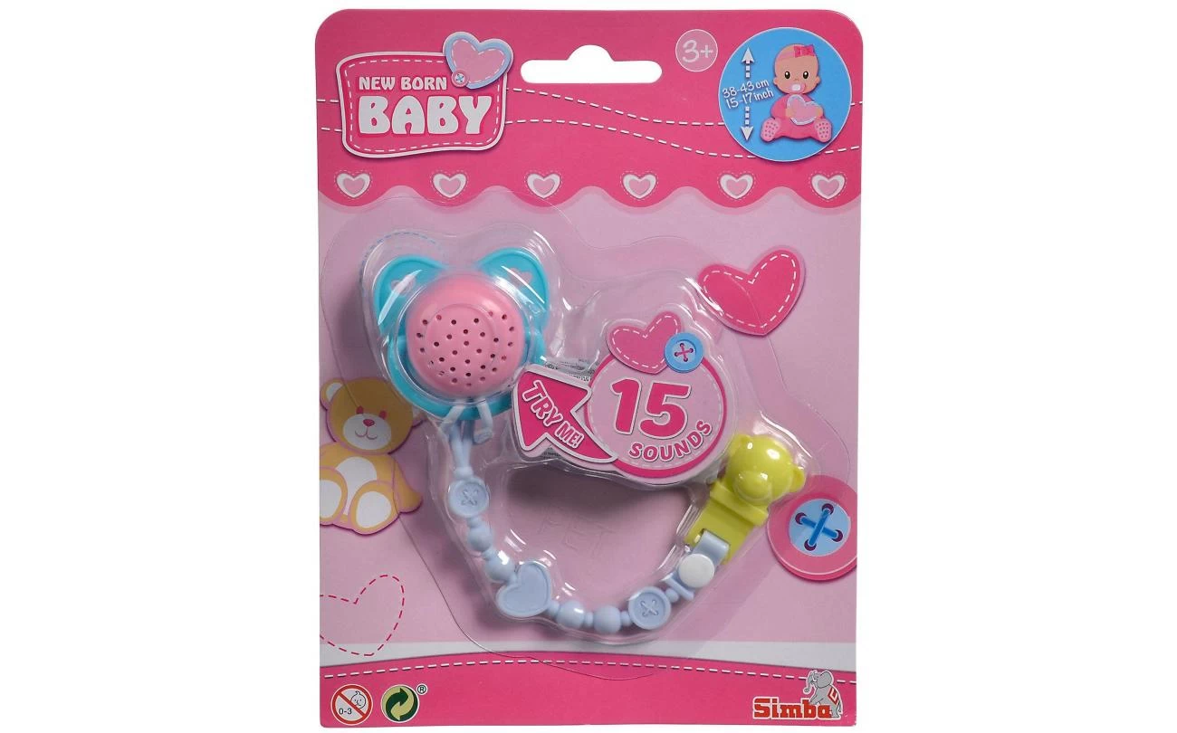 Met de New Born Baby-fopspeen met geluidsfunctie kan ja elke pop in geen tijd kalmeren. De fopspeen heeft 15 klanken en kan worden bevestigd met clip en ketting op de romper.