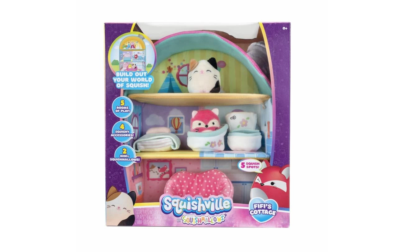 Er is geen betere plek dan thuis! Kruip in een van de gezelligste accommodaties die de Squishville wereld te bieden heeft, Fifi’s hut. Dit schattige pluche huisje komt met 2 van de meest populaire Squishmallows, Cam de kat en Fifi de vos, in een mini formaat van 5cm. De prachtige cottage met drie verdiepingen is perfect om deze spannende nieuwe wereld uit te breiden. De Squishville-wereld is volledig gemaakt van pluche en bestaat uit een superzachte marshmallow-achtige vulling, waardoor het de gezelligste plek ter wereld is. Knijp en pers Cam en Fifi in de bank, het toilet, de schoorsteen en nog veel meer. Er zijn 5 leuke kamers om je in te wurmen en 4 gezellige accessoires om mee te spelen. Vul je Squishville wereld aan met al je Squishmallows favorieten in hun nieuwe 5cm formaat. Met voertuigen, speeltoestellen en je favoriete Squishmallows, biedt Squishville een schat aan Squish-mogelijkheden.
