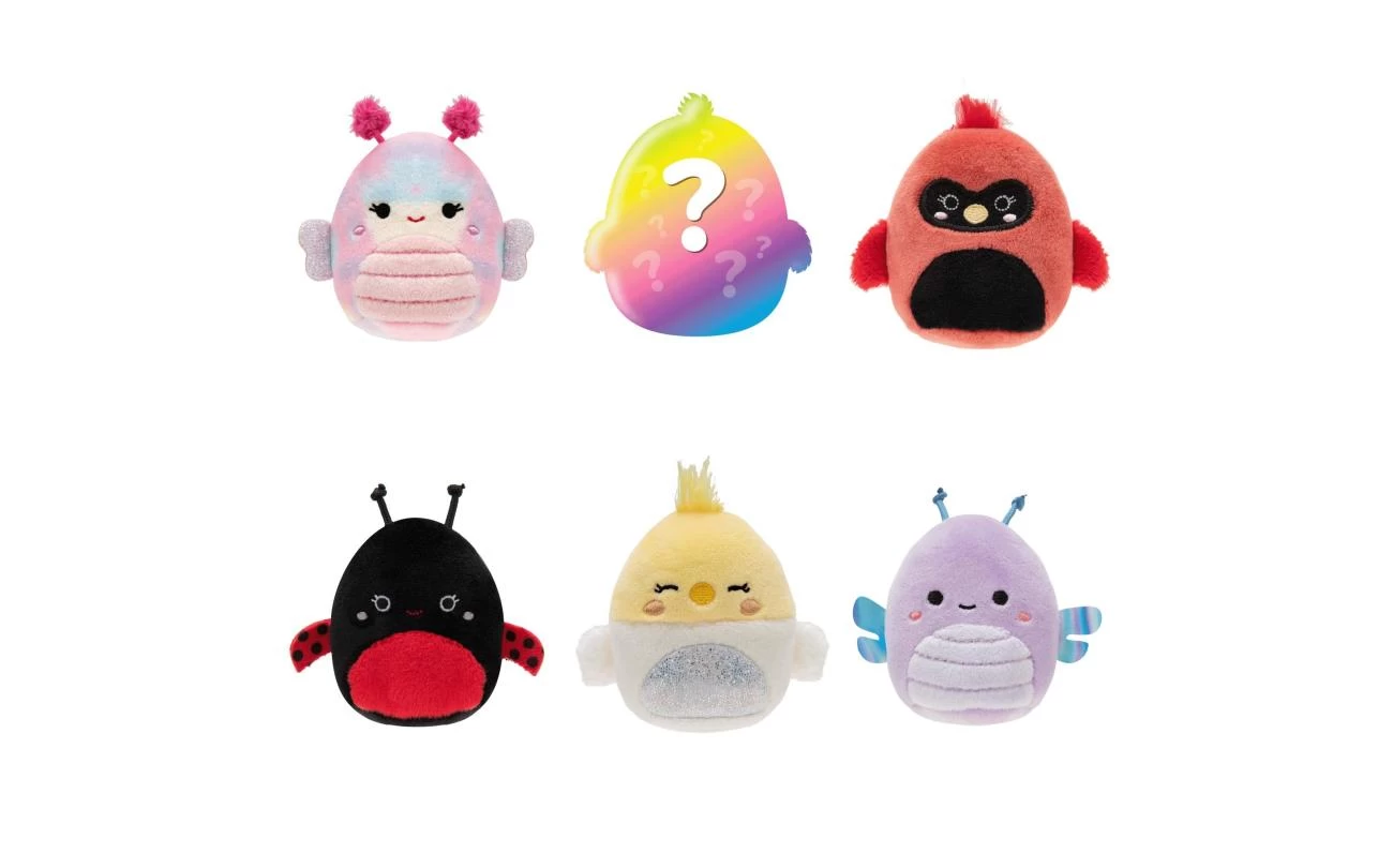 Mini-sized en superzachte Squishmallows-knuffels in een verpakking van zes knuffels. 5 Van de knuffels zijn zichtbaar en 1 is verborgen. Kun jij raden hoe de verrassingsknuffel er uit de verpakking uitziet?