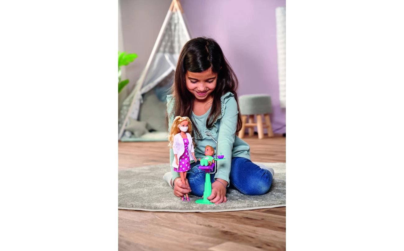 Steffi als tandarts – Steffi houdt van haar werk als tandarts en zorgt elke dag voor haar kleine patiënten. Dit keer heeft kleine Timmy plaatsgenomen op de behandelstoel. Om voldoende hygiëne te garanderen, draagt ​​Steffi ook een gezichtsmasker. • Inhoud van de set – naast de 29 cm lange Steffi Fashion pop in een doktersjas, bevat de set ook de 12 cm lange Timmy, een tandartsstoel en andere geschikte accessoires. • Grote verscheidenheid aan onderwerpen – het Steffi LOVE-assortiment omvat veel verschillende categorieën, zoals mode, sprookjes, dieren, paarden en woonruimtes. Door de verscheidenheid aan onderwerpen kunnen meisjes zich altijd verdiepen in nieuwe rollen en deze uitbeelden.