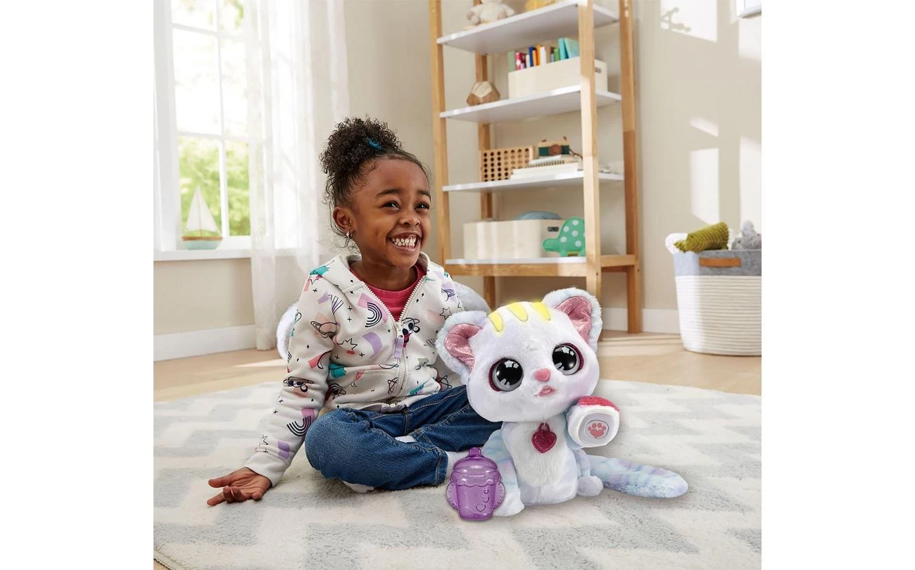 Ruby, je interactieve knuffelkat! Plaats het bijgesloten inkt stempelkussen op haar pootje en druk op haar hoofd. Ruby zal je helemaal zelf een glittertattoo geven! Druk op haar buikje wanneer ze miauwt om te horen wat ze zegt. Inclusief flesje voor rollenspel en 4 interactieve toetsen; hoofd, rug, mond en buik. 11 verschillende kleurpatronen op haar hoofd geven aan hoe Ruby zich voelt. Ontdek 4 gezongen liedjes, vrolijke zinnetjes en muziek.