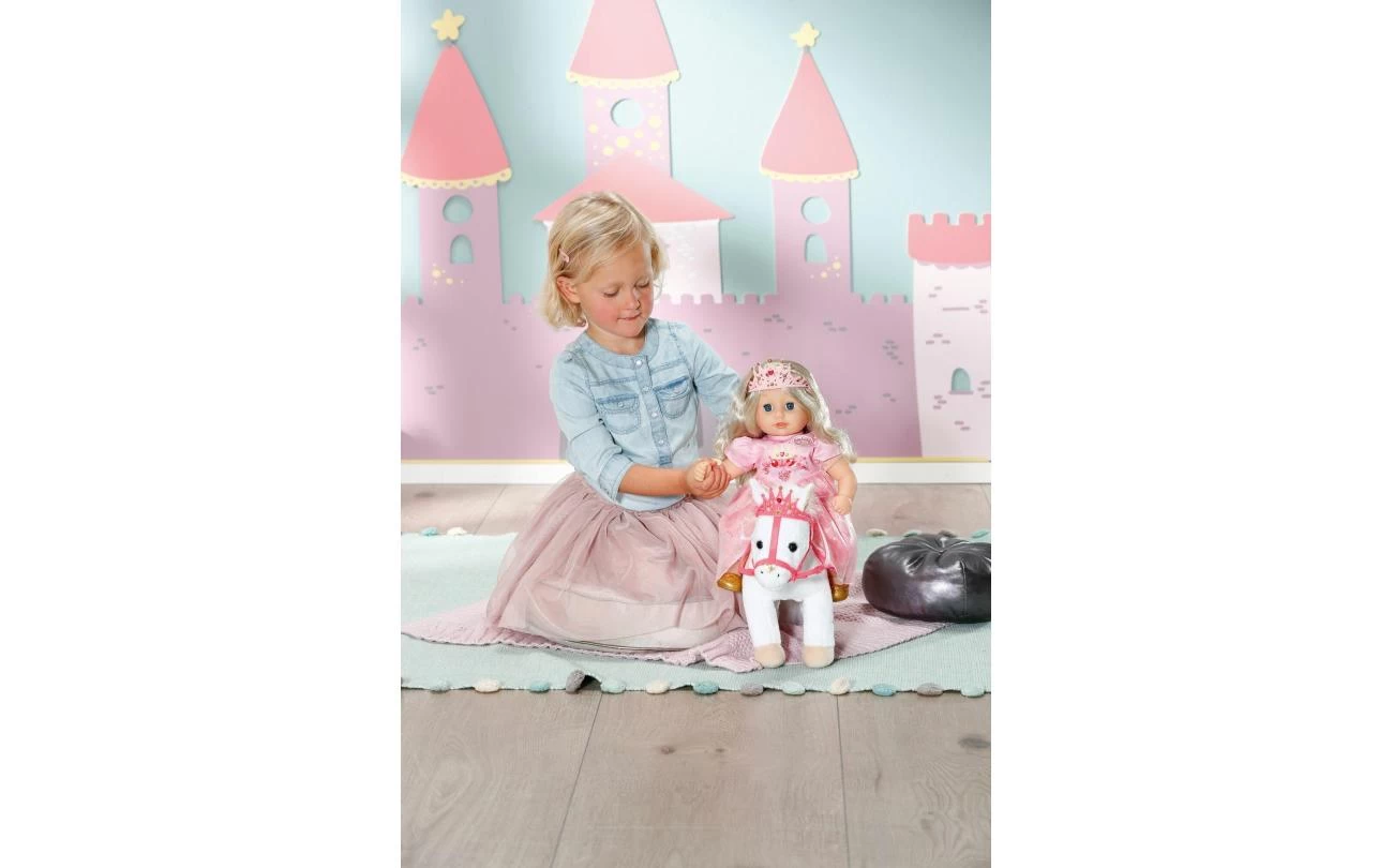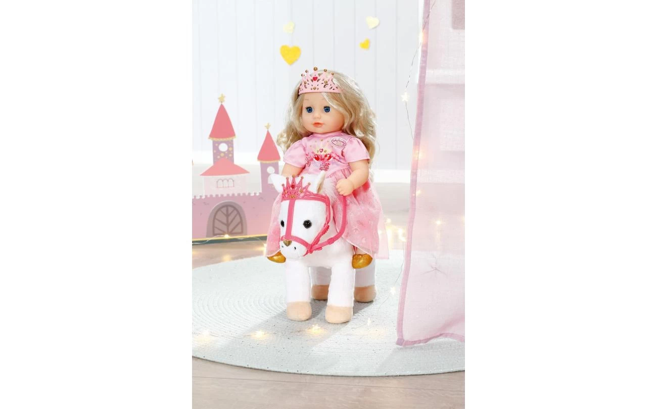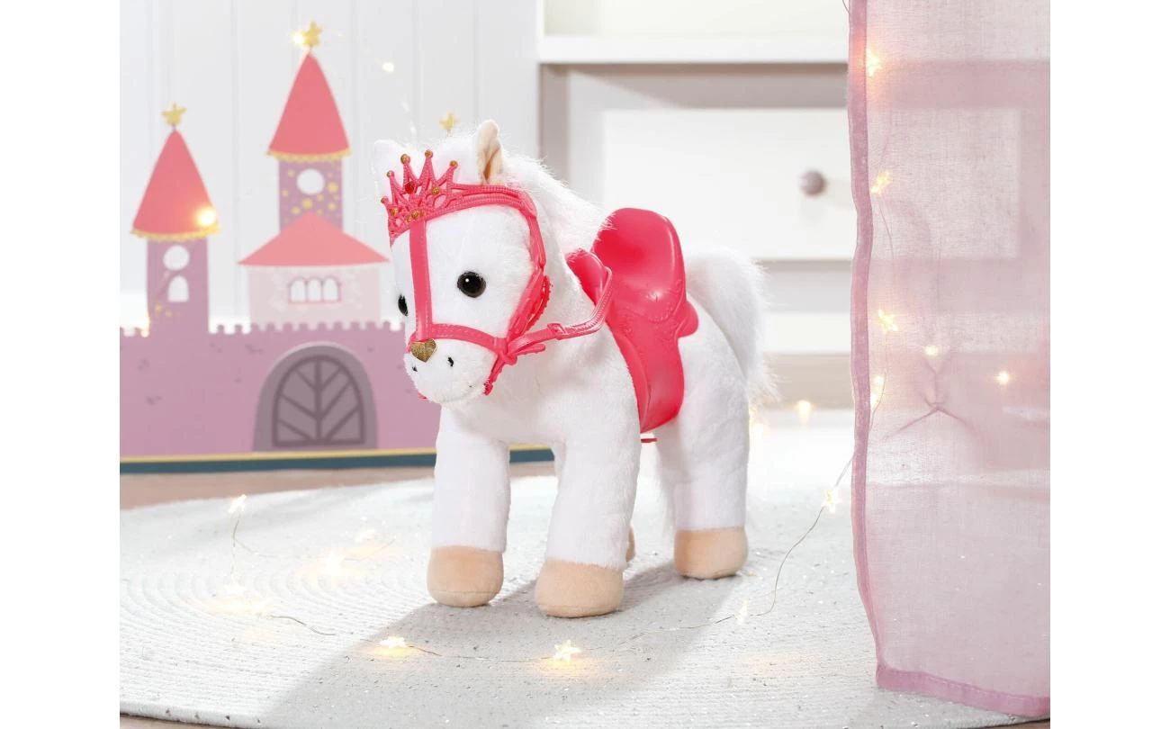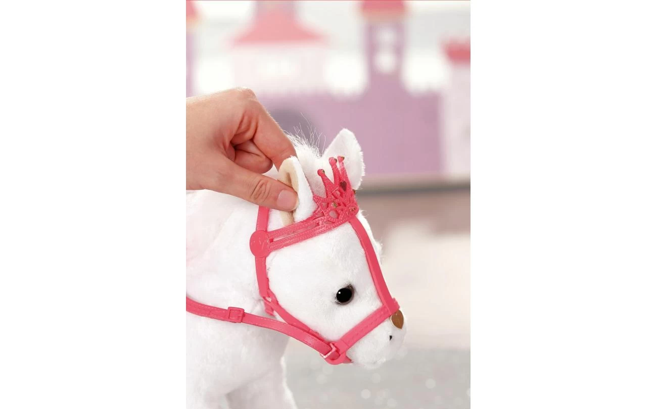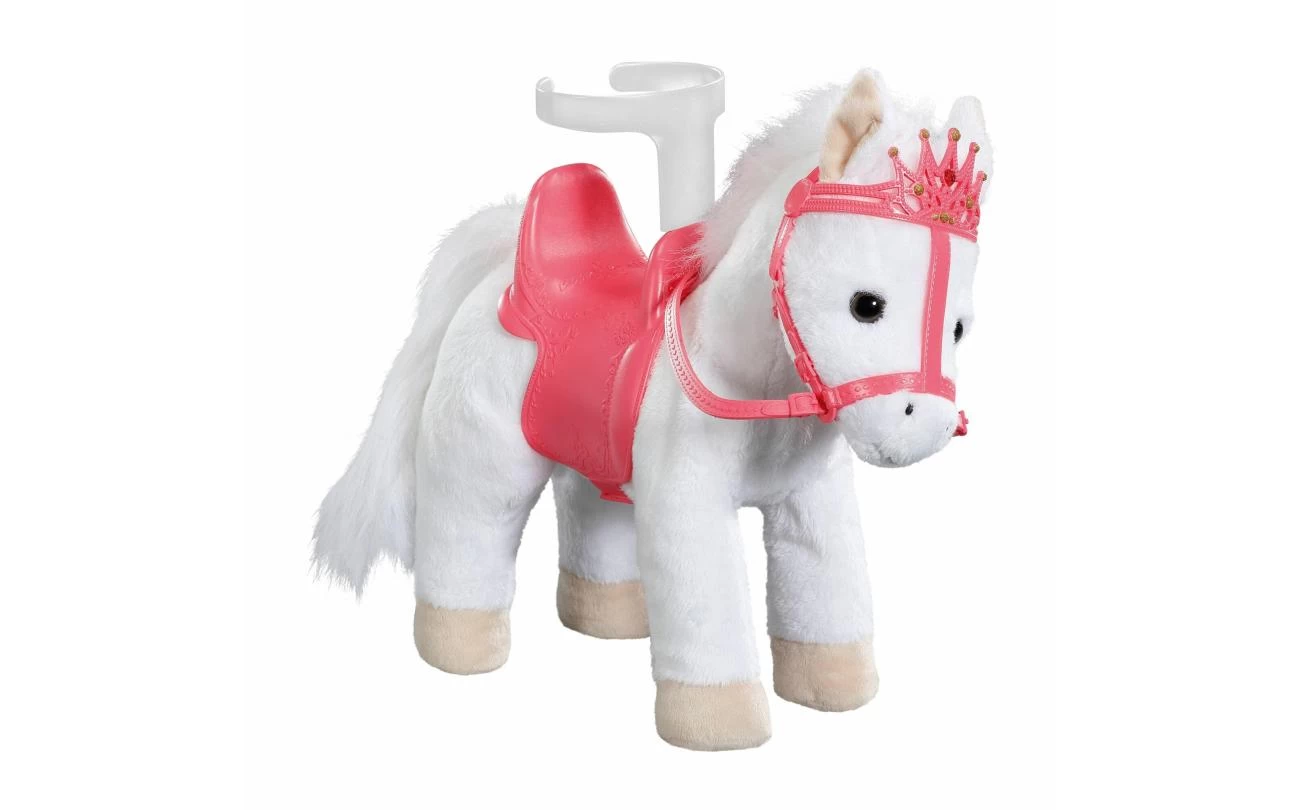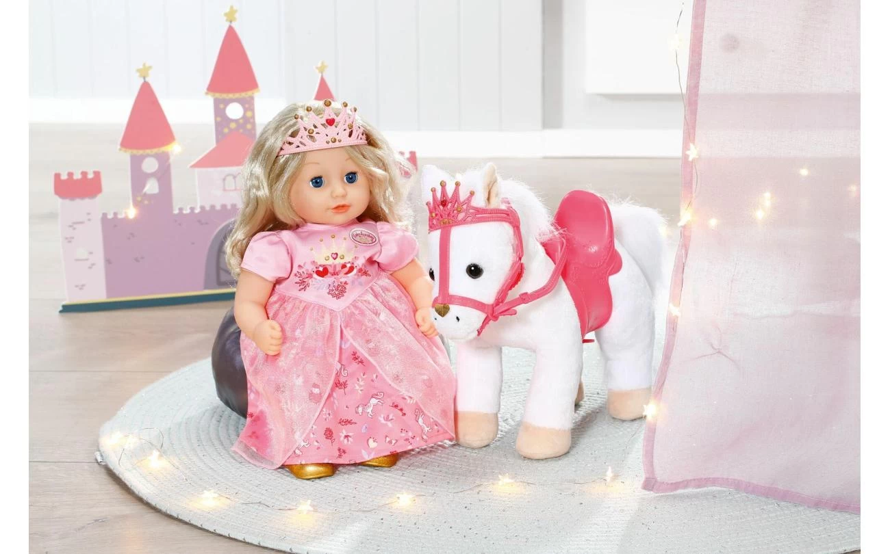 Deze witte pony heeft een koninklijk zadel en hoofdstel met een glinsterende kroon waar zijn grappige, alerte oren achter vandaan piepen. Als je in zijn rechteroor knijpt, begint de pony te hinniken of snuiven. Knijp je in zijn linkeroor, dan hoor je hoefgetrappel. Little Annabell is stapelverliefd op haar dierenmaatje en geeft haar pony vaak een kusje op zijn neus. Hij antwoordt haar dan met zijn eigen kusgeluid. De kleine prinses zit comfortabel in het zadel tijdens de rit, omdat de poppenhouder ervoor zorgt dat ze er niet afvalt.
