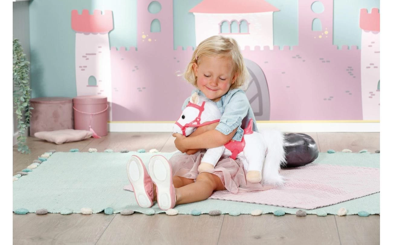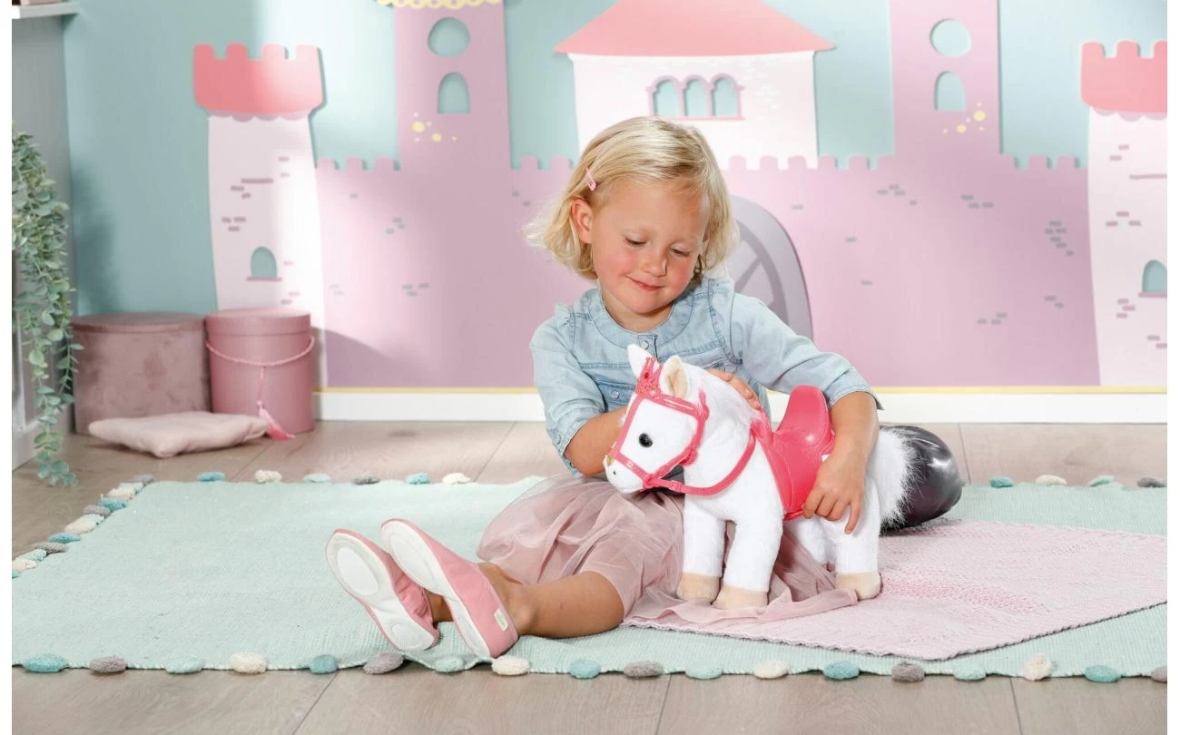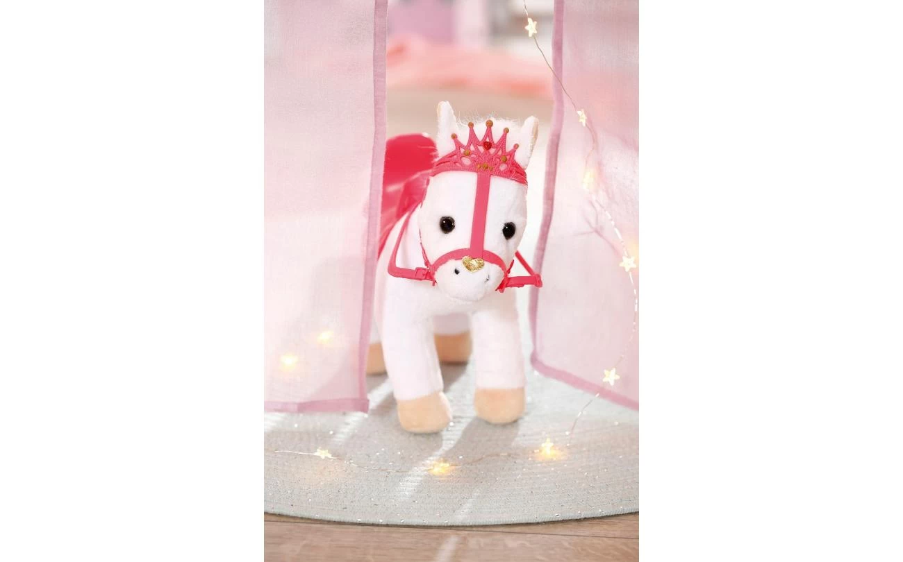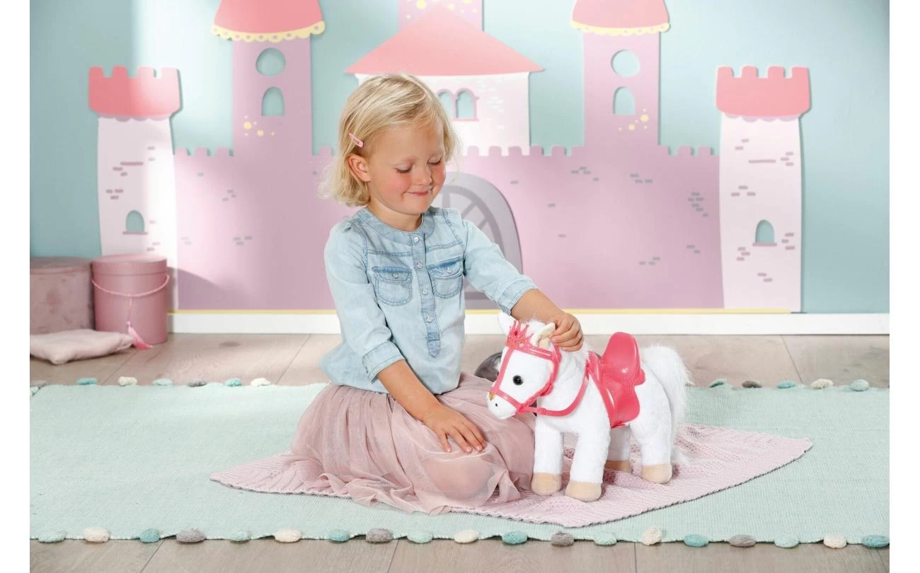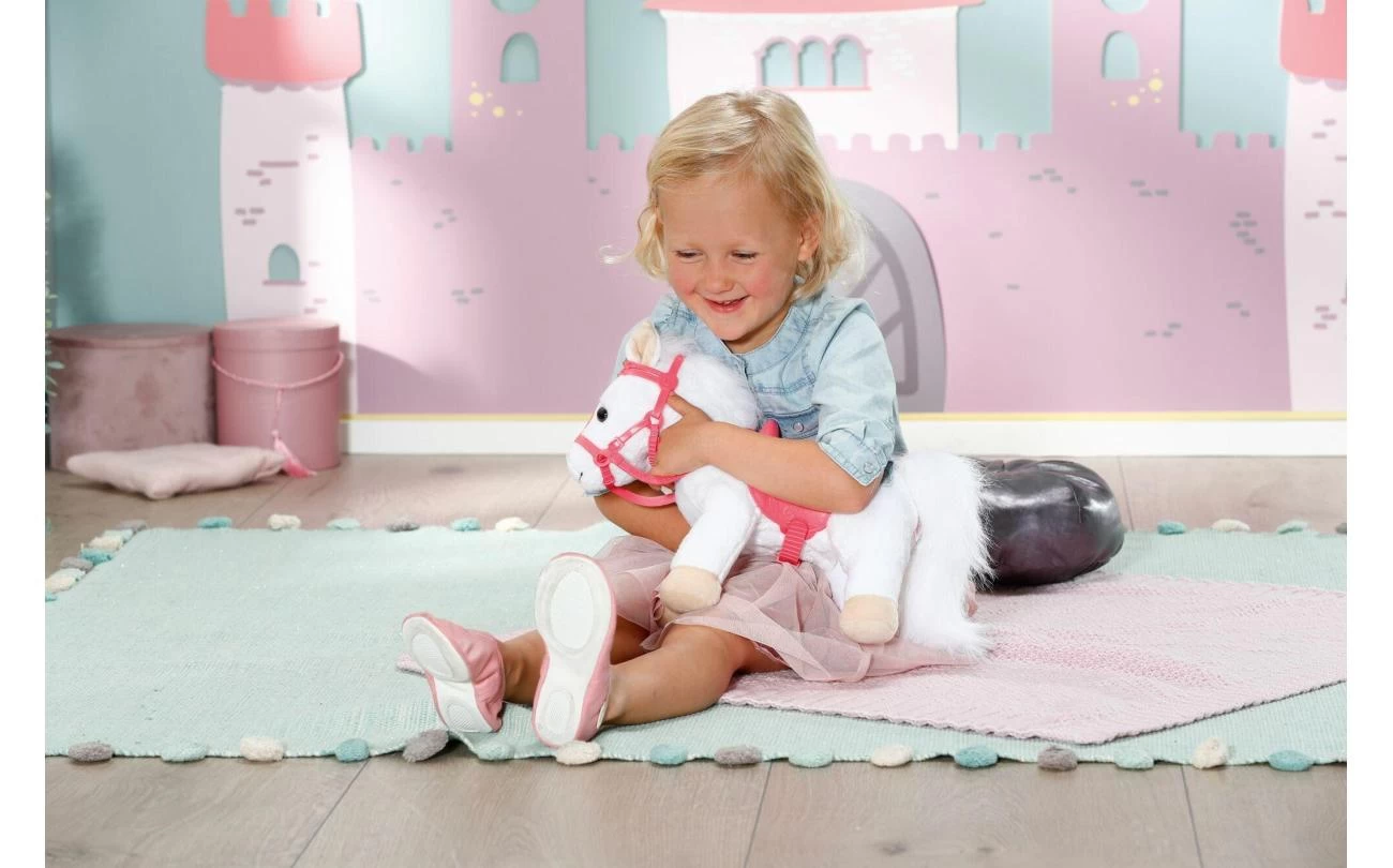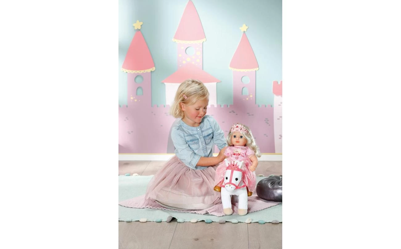 Deze witte pony heeft een koninklijk zadel en hoofdstel met een glinsterende kroon waar zijn grappige, alerte oren achter vandaan piepen. Als je in zijn rechteroor knijpt, begint de pony te hinniken of snuiven. Knijp je in zijn linkeroor, dan hoor je hoefgetrappel. Little Annabell is stapelverliefd op haar dierenmaatje en geeft haar pony vaak een kusje op zijn neus. Hij antwoordt haar dan met zijn eigen kusgeluid. De kleine prinses zit comfortabel in het zadel tijdens de rit, omdat de poppenhouder ervoor zorgt dat ze er niet afvalt.