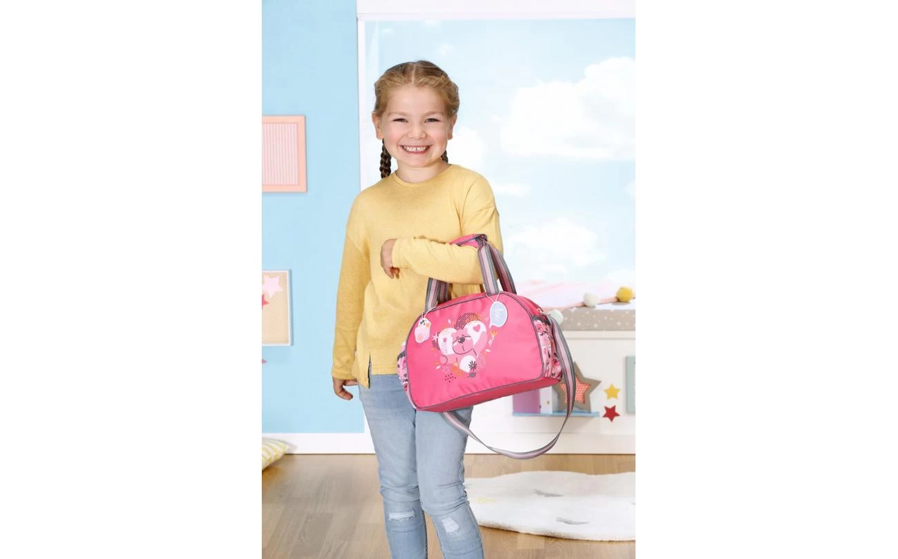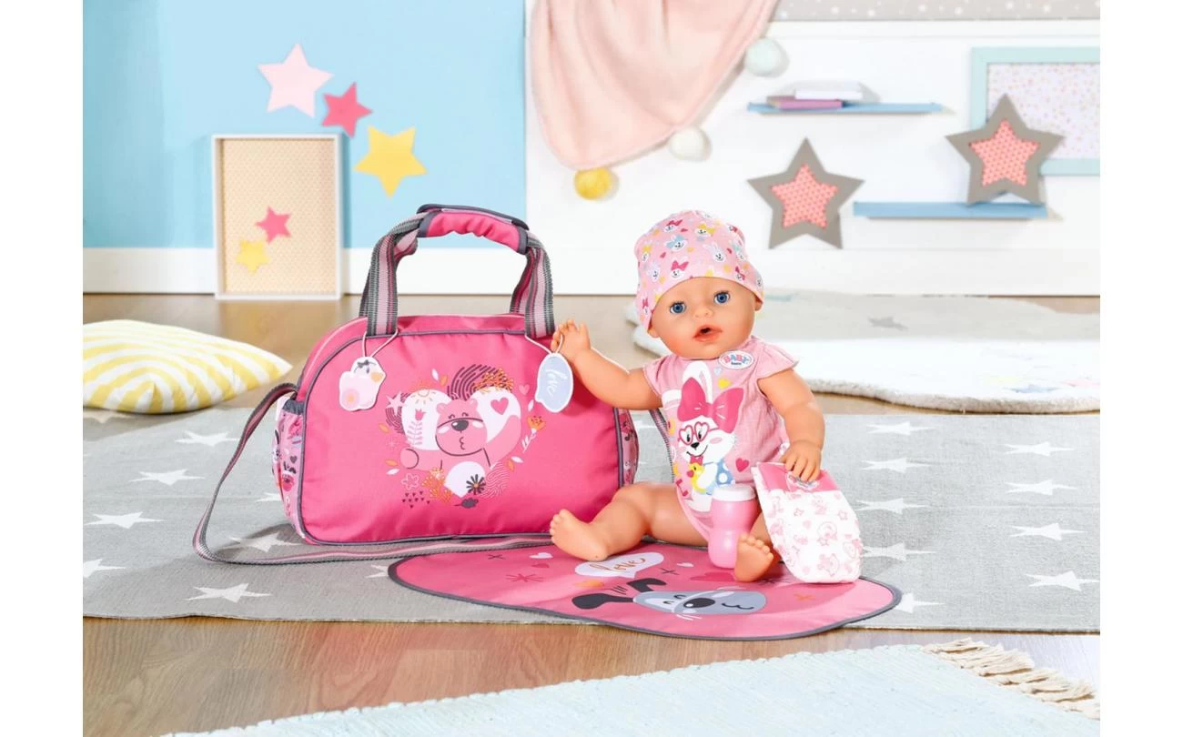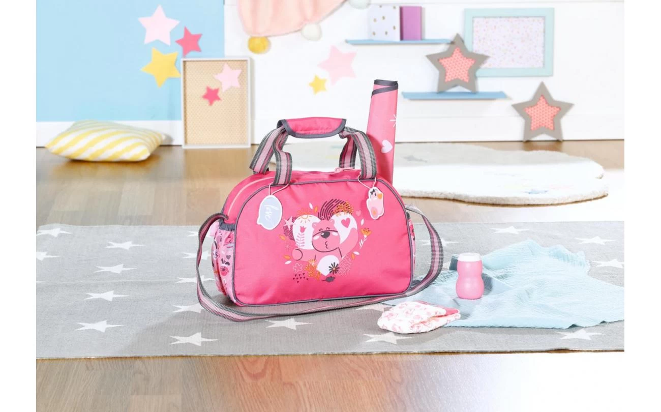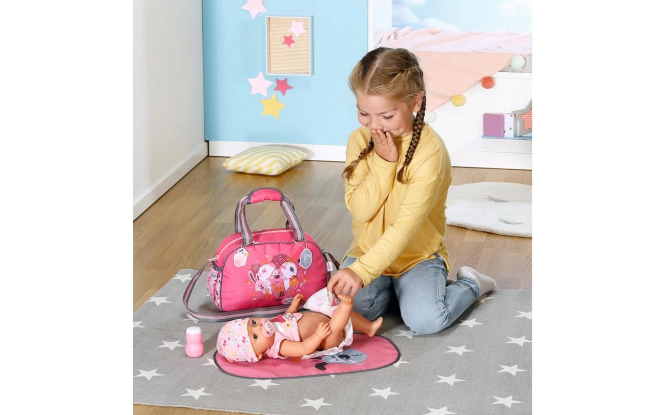 BABY born verheugt zich op elk uitstapje, net als haar dierenvrienden op de luiertas. Oeps, ze was zo opgewonden dat ze een plasje heeft gedaan. Gelukkig heeft mama de handige luiertas meegenomen, waar alles inzit wat een baby nodig heeft: een verschoonmatje, een luier en een flesje poeder. Er is ook genoeg plek voor een flesje om tussendoor uit te drinken, een overzicht van de bustijden en eventuele souvenirs. Je kunt de tas comfortabel over je schouder of in je hand dragen. Aan de draagbanden zitten schattige labels waar BABY born mee kan spelen terwijl ze wordt verschoond.